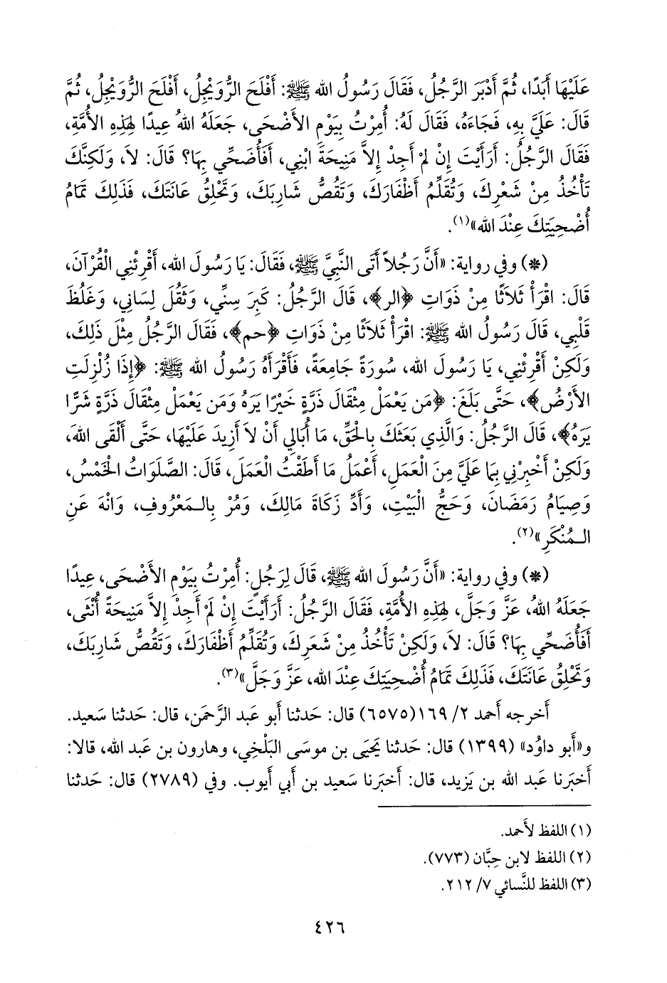 - وفي رواية: «أن رسول الله صَلى الله عَليه وسَلم قال لرجل: أمرت بيوم الأضحى، عيدا جعله الله، عز وجل، لهذه الأمة، فقال الرجل: أرأيت إن لم أجد إلا منيحة أنثى، أفأضحي بها؟ قال: لا، ولكن تأخذ من شعرك، وتقلم أظفارك، وتقص شاربك، وتحلق عانتك، فذلك تمام أُضحِيَتك عند الله، عز وجل» (¬٢).