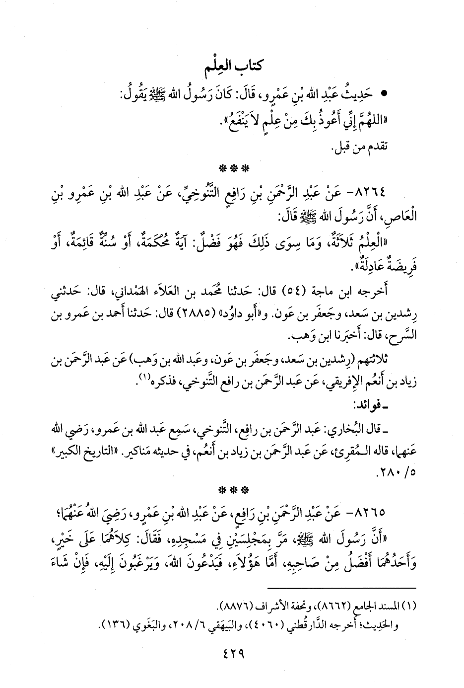 ثلاثتهم (رِشْدِين بن سعد، وجعفر بن عون، وعبد الله بن وهب) عن عبد الرَّحمَن بن زياد بن أَنْعُم الإفريقي، عن عبد الرَّحمَن بن رافع التنوخي، فذكره (¬١).