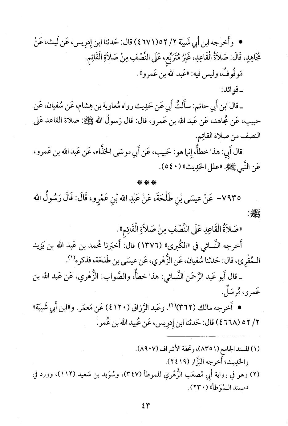 - قال عبد الرَّحمَن بن أبي حاتم الرازي: سألت أبي عن حديث رواه معاوية بن هشام، عن سفيان، عن حبيب، عن مجاهد، عن عبد الله بن عَمرو، قال: قال رسول الله صَلى الله عَليه وسَلم: صلاة القاعد على النصف من صلاة القائم.