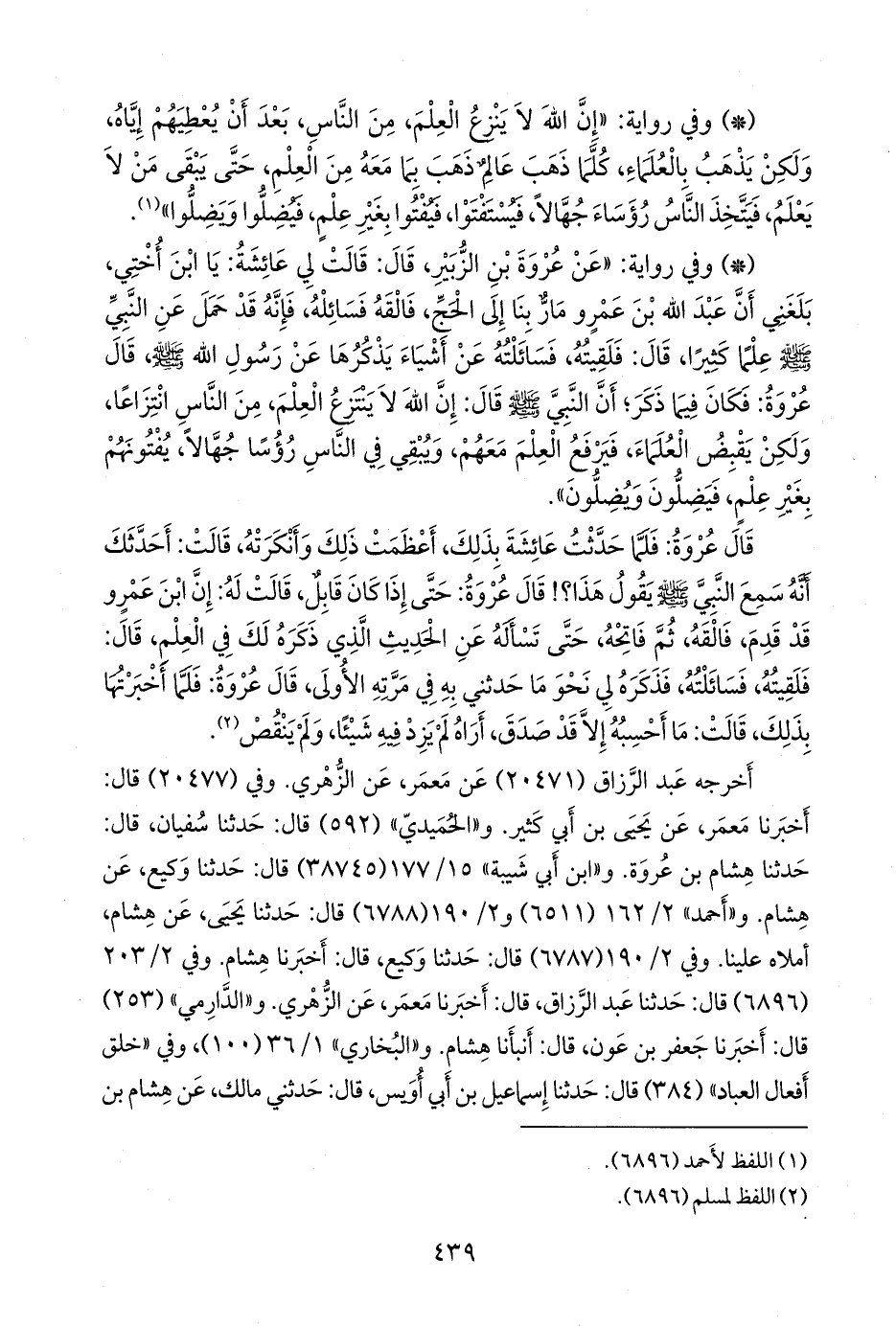 قال عروة: فلما حدثت عائشة بذلك، أعظمت ذلك وأنكرته، قالت: أحدثك أنه سمع النبي صَلى الله عَليه وسَلم يقول هذا؟! قال عروة: حتى إذا كان قابل، قالت له: إن ابن عَمرو قد قدم، فالقه، ثم فاتحه، حتى تسأله عن الحديث الذي ذكره لك في العلم، قال: فلقيته، فسائلته، فذكره لي نحو ما حدثني به في مرته الأولى، قال عروة: فلما أخبرتها بذلك، قالت: ما أحسبه إلا قد صدق، أراه لم يزد فيه شيئا، ولم ينقص (¬١).