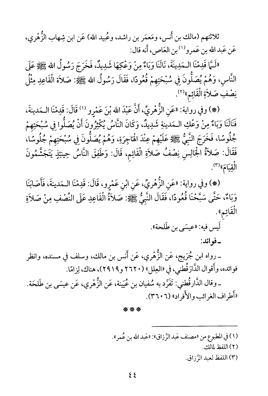 - وفي رواية: «عن الزُّهْري، عن ابن عَمرو، قال: قدمنا المدينة، فأصابنا وباء، حتى سبحنا قعودا، فقال النبي صَلى الله عَليه وسَلم: صلاة القاعد على النصف من صلاة القائم».