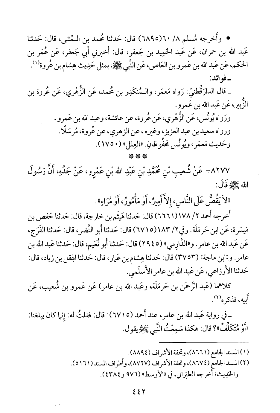 ٨٢٧٦ م- عن عمر بن الحكم بن رافع الأنصاري، عن عبد الله بن عمرو بن العاص، عن النبي صَلى الله عَليه وسَلم، بمثل حديث هشام بن عروة.