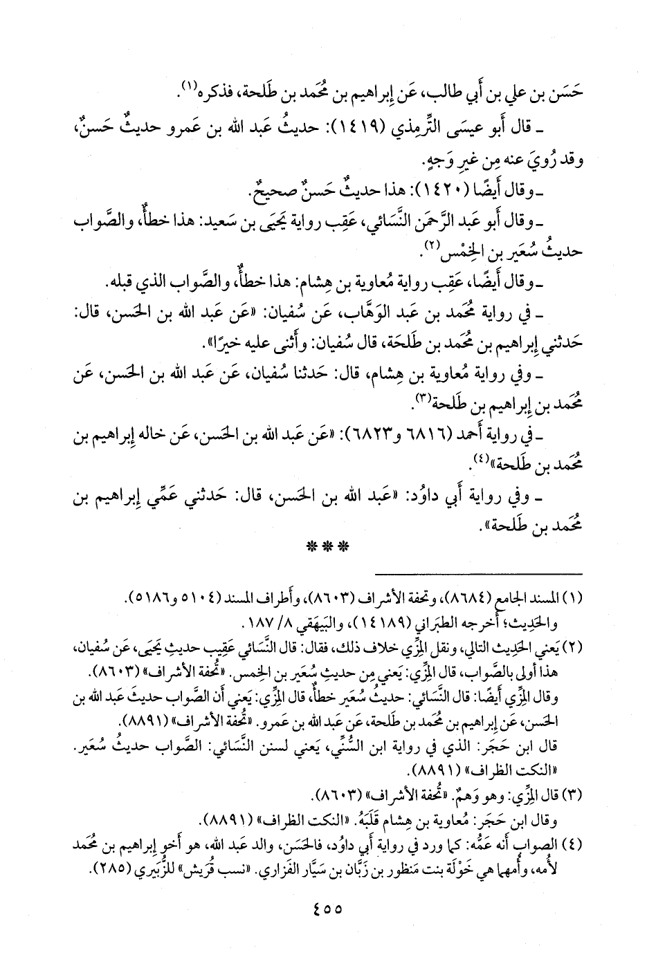 - وفي رواية أبي داود: «عبد الله بن الحسن، قال: حدثني عمي إبراهيم بن محمد بن طلحة».