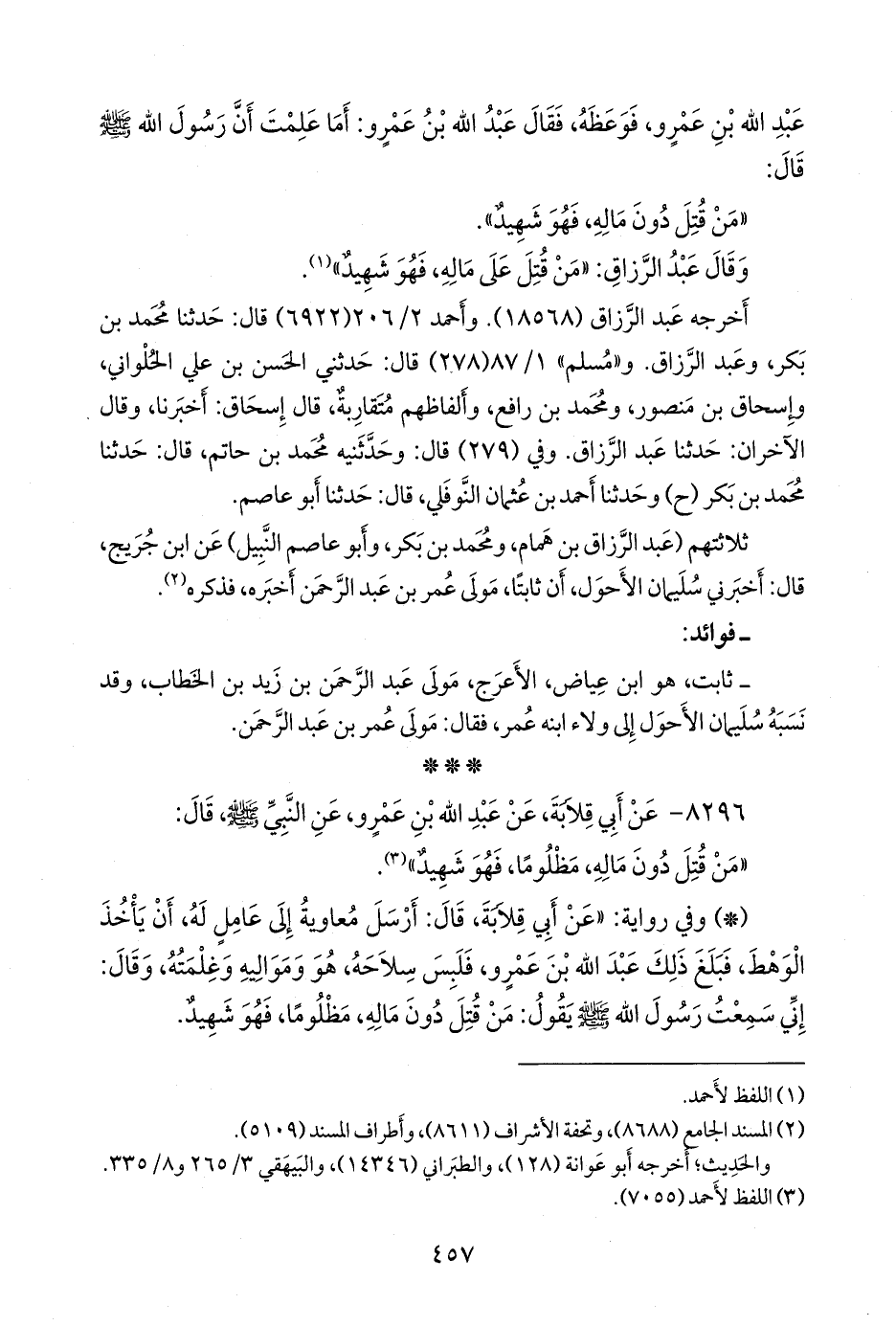 - وفي رواية: «عن أبي قلابة، قال: أرسل معاوية إلى عامل له، أن يأخذ الوهط، فبلغ ذلك عبد الله بن عَمرو، فلبس سلاحه، هو ومواليه وغلمته، وقال: إني سمعت رسول الله صَلى الله عَليه وسَلم يقول: من قتل دون ماله، مظلوما، فهو شهيد، فكتب الأمير إلى معاوية: أن قد تيسر للقتال، وقال: إني سمعت رسول الله صَلى الله عَليه وسَلم يقول: من قتل دون ماله، فهو شهيد».