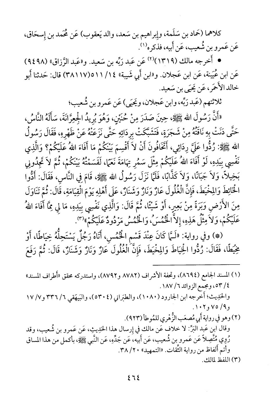 «أن رسول الله صَلى الله عَليه وسَلم حين صدر من حنين، وهو يريد الجِعْرَانة، سأله الناس، حتى دنت به ناقته من شجرة، فتشبكت بردائه حتى نزعته عن ظهره، فقال رسول الله صَلى الله عَليه وسَلم: ردوا علي ردائي، أتخافون أن لا أقسم بينكم ما أفاء الله عليكم؟ والذي نفسي بيده، لو أفاء الله عليكم مثل سمر تهامة نعما، لقسمته بينكم، ثم لا تجدوني بخيلا، ولا جبانا، ولا كذابا، فلما نزل رسول الله صَلى الله عَليه وسَلم قام في الناس، فقال: أدوا الخائط والمخيط، فإن الغلول عار ونار وشنار، على أهله يوم القيامة، قال: ثم تناول من الأرض وبرة من بعير، أو شيئا، ثم قال: والذي نفسي بيده، ما لي مما أفاء الله عليكم، ولا مثل هذه، إلا الخمس، والخمس مردود عليكم» (¬٣).
