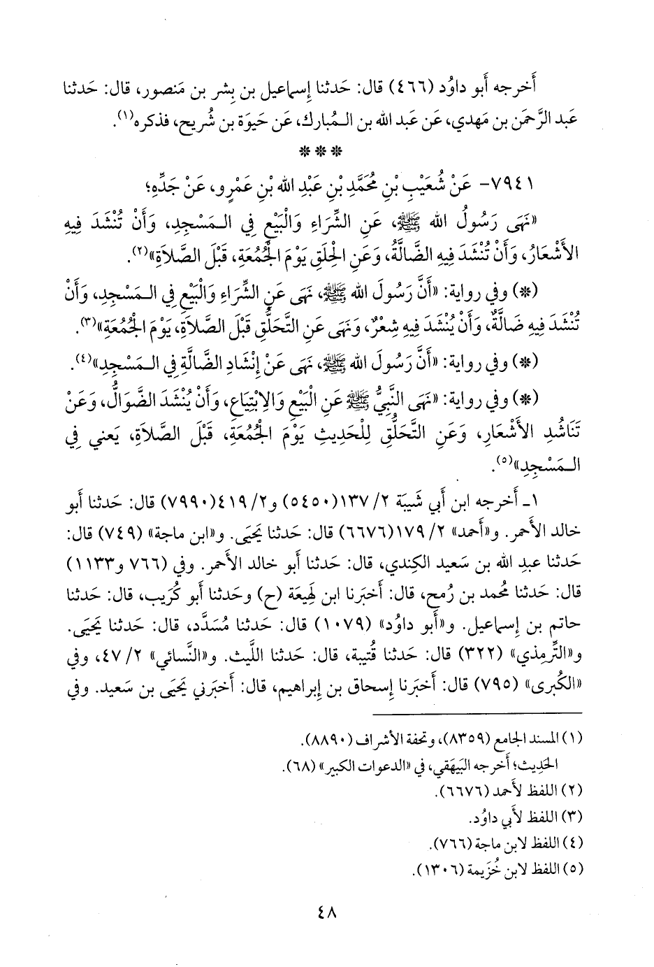 - وفي رواية: «أن رسول الله صَلى الله عَليه وسَلم نهى عن الشراء والبيع في المسجد، وأن تنشد فيه ضالة، وأن ينشد فيه شعر، ونهى عن التحلق قبل الصلاة، يوم الجمعة» (¬٢).