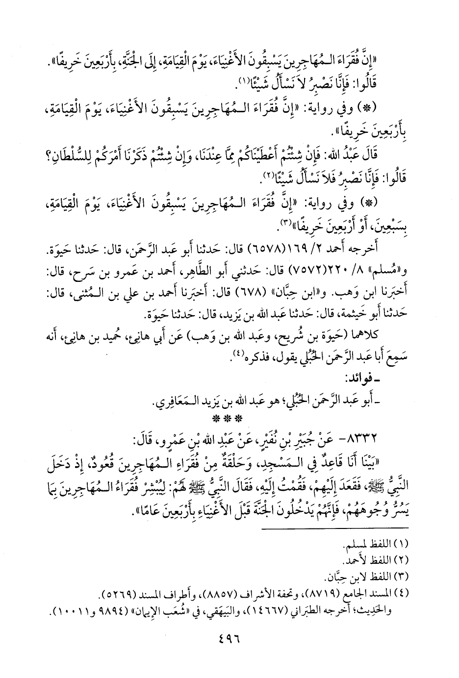 - وفي رواية: «إن فقراء المهاجرين يسبقون الأغنياء، يوم القيامة، بسبعين، أو أربعين خريفا» (¬١).