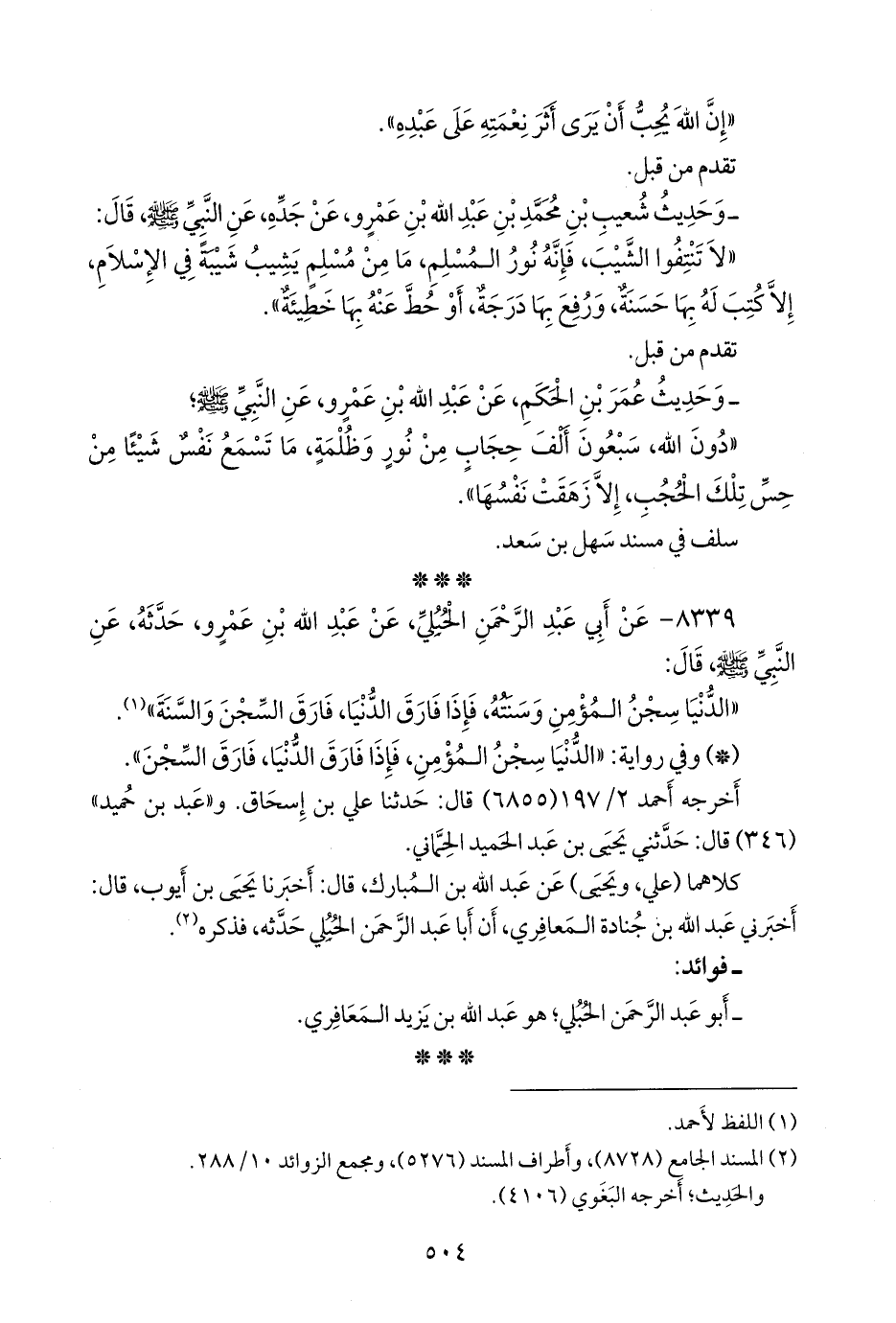 ٨٣٣٩ - عن أبي عبد الرَّحمَن الحبلي، عن عبد الله بن عَمرو، حدثه، عن النبي صَلى الله عَليه وسَلم قال: