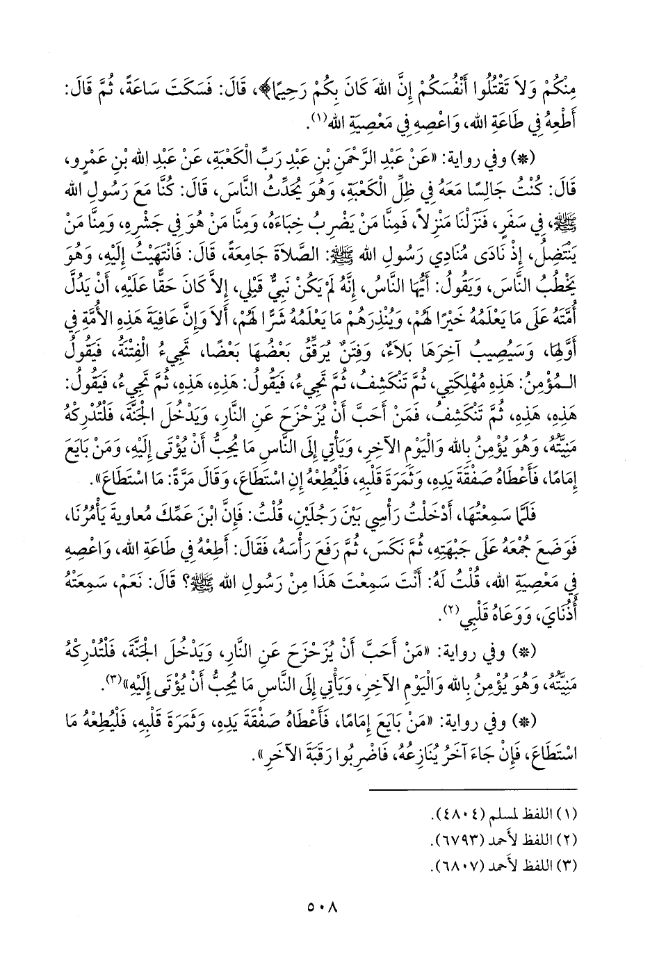 - وفي رواية: وفي رواية: «عن عبد الرحمن بن عبد رب الكعبة، عن عبد الله بن عمرو، قال: كنت جالسا معه في ظل الكعبة وهو يحدث الناس، قال: كنا مع رسول الله صَلى الله عَليه وسَلم في سفر، فنزلنا منزلا، فمنا من يضرب خباءه، ومنا من هو في جشره، ومنا من ينتضل، إذ نادى منادي رسول الله صَلى الله عَليه وسَلم: الصلاة جامعة، قال: فانتهيت إليه وهو يخطب الناس، ويقول: أيها الناس، إنه لم يكن نبي قبلي، إلا كان حقا عليه أن يدل أمته على ما يعلمه خيرًا لهم، وينذرهم ما يعلمه شرا لهم، ألا وإن عافية هذه الأمة في أولها، وسيصيب آخرها بلاء وفتن، يرقق بعضها بعضا، تجيء الفتنة، فيقول المؤمن: هذه مهلكتي، ثم تنكشف، ثم تجيء، فيقول: هذه هذه، ثم تجيء، فيقول: هذه هذه، ثم تنكشف، فمن أحب أن يزحزح عن النار، ويدخل الجنة، فلتدركه منيته وهو يؤمن بالله واليوم الآخر، ويأتي إلى الناس ما يحب أن يؤتى إليه، ومن بايع إماما، فأعطاه صفقة يده، وثمرة قلبه، فليطعه إن استطاع، وقال مرة: ما استطاع».