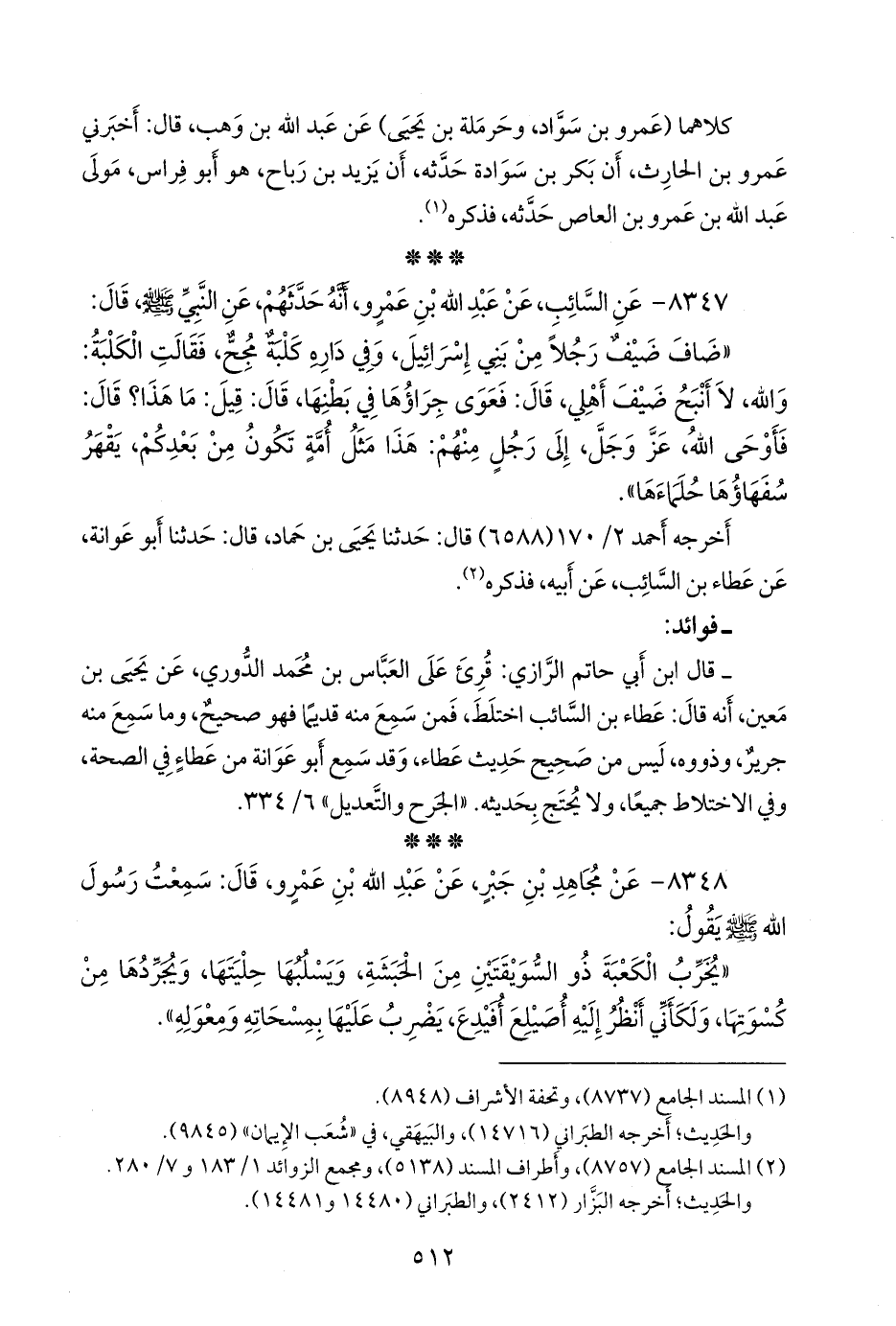 ٨٣٤٧ - عن السائب، عن عبد الله بن عَمرو، أنه حدثهم، عن النبي صَلى الله عَليه وسَلم قال: