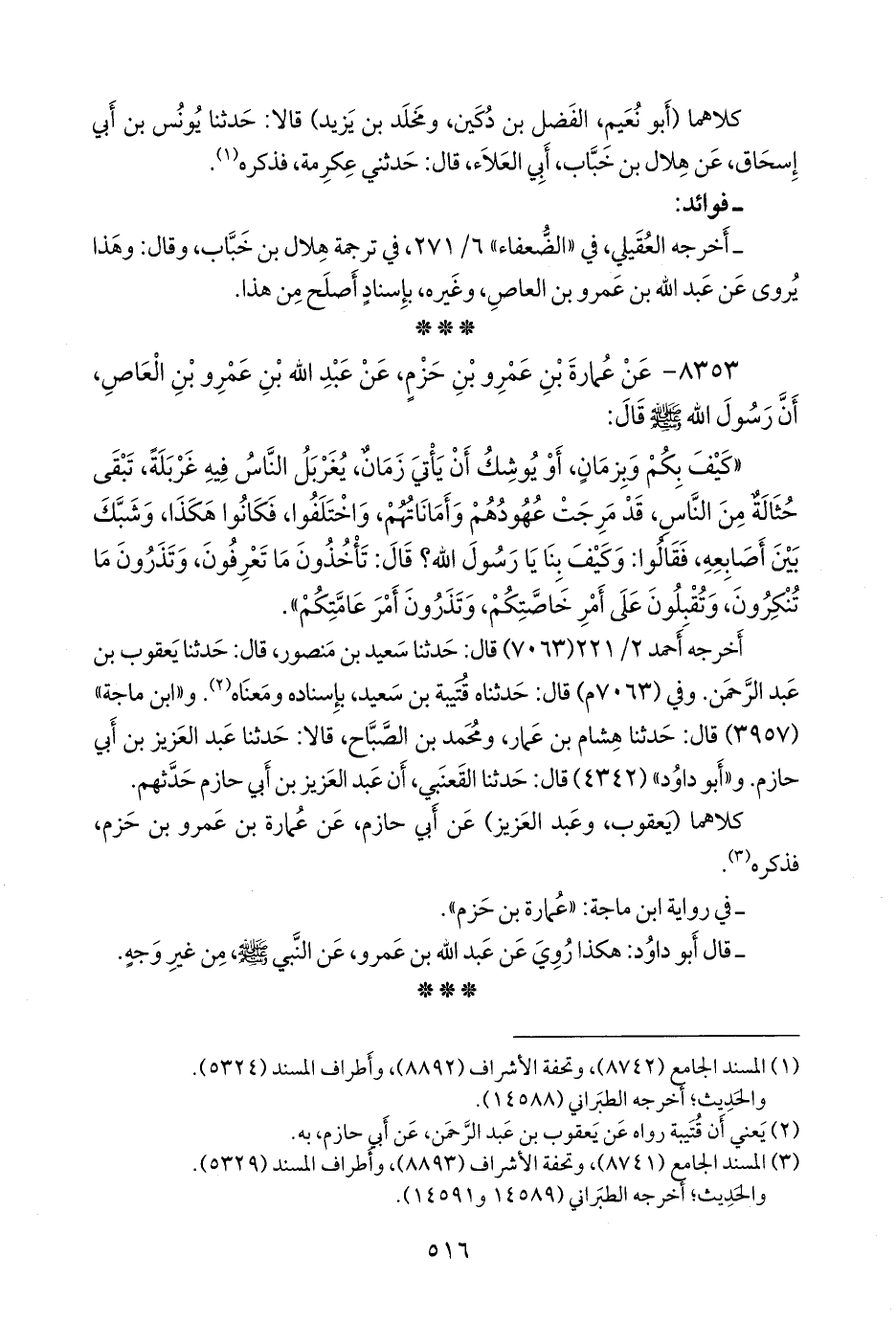 ٨٣٥٣ - عن عمارة بن عَمرو بن حزم، عن عبد الله بن عَمرو بن العاص، أن رسول الله صَلى الله عَليه وسَلم قال: