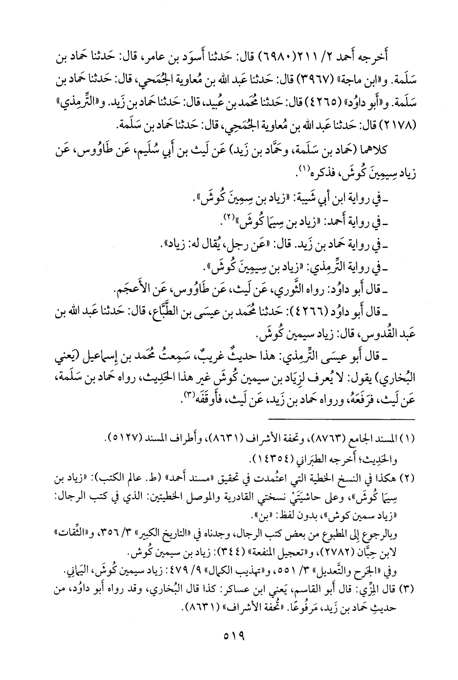- قال التِّرمِذي: هذا حديثٌ غريبٌ، سمعت محمد بن إسماعيل، يعني البخاري، يقول: لا يعرف لزياد بن سيمين كوش غير هذا الحديث، رواه حماد بن سلمة، عن ليث، فرفعه، ورواه حماد بن زيد، عن ليث، فأوقفه (¬١).