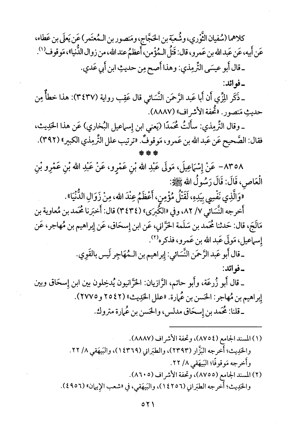 - وقال الدارقُطني: تفرد به محمد بن إسحاق، عن إبراهيم بن مهاجر، عن إسماعيل مولى عبد الله بن عَمرو. «أطراف الغرائب والأفراد» (٣٥٤٨).