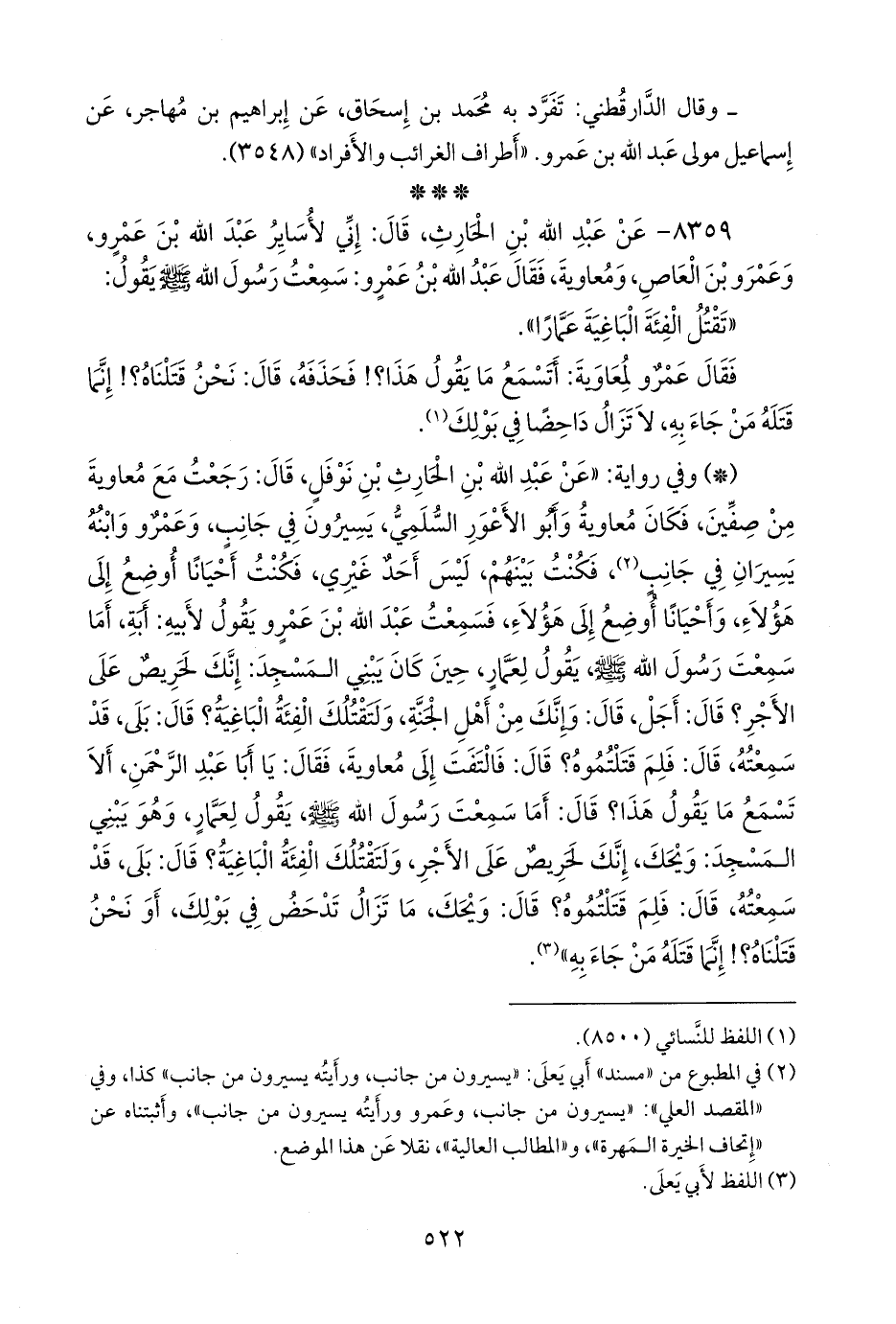- وفي رواية: «عن عبد الله بن الحارث بن نوفل، قال: رجعت مع معاوية من صفين، فكان معاوية وأبو الأعور السلمي يسيرون في جانب، وعمرو وابنه يسيرون في جانب، فكنت بينهم ليس أحد غيري، فكنت أحيانا أوضع إلى هؤلاء، وأحيانا أوضع إلى هؤلاء، فسمعت عبد الله بن عمرو يقول لأبيه: يا أبة، أما سمعت رسول الله صَلى الله عَليه وسَلم يقول لعمار حين كان يبني المسجد: إنك لحريص على الأجر؟ قال: أجل، قال: وإنك من أهل الجنة ولتقتلك الفئة الباغية؟ قال: بلى، قد سمعته، قال: فلم قتلتموه؟ قال: فالتفت إلى معاوية، فقال: يا أبا عبد الرحمن، ألا تسمع ما يقول هذا؟ قال: أما سمعت رسول الله صَلى الله عَليه وسَلم يقول لعمار وهو يبني المسجد: ويحك، إنك لحريص على الأجر، ولتقتلك الفئة الباغية؟ قال: بلى، قد سمعته، قال: فلم قتلتموه؟ قال: ويحك، ما تزال تدحض في بولك، أَوَنَحنُ قتلناه؟! إنما قتله من جاء به» (¬٢).