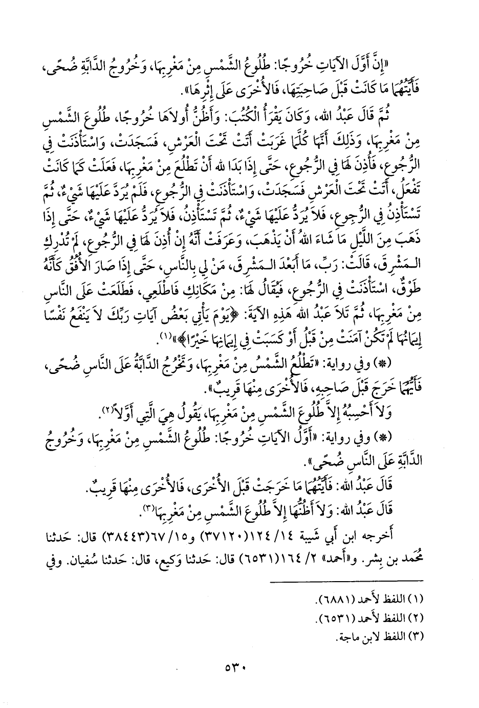 - وفي رواية: «أول الآيات خروجا: طلوع الشمس من مغربها، وخروج الدابة على الناس ضحى».