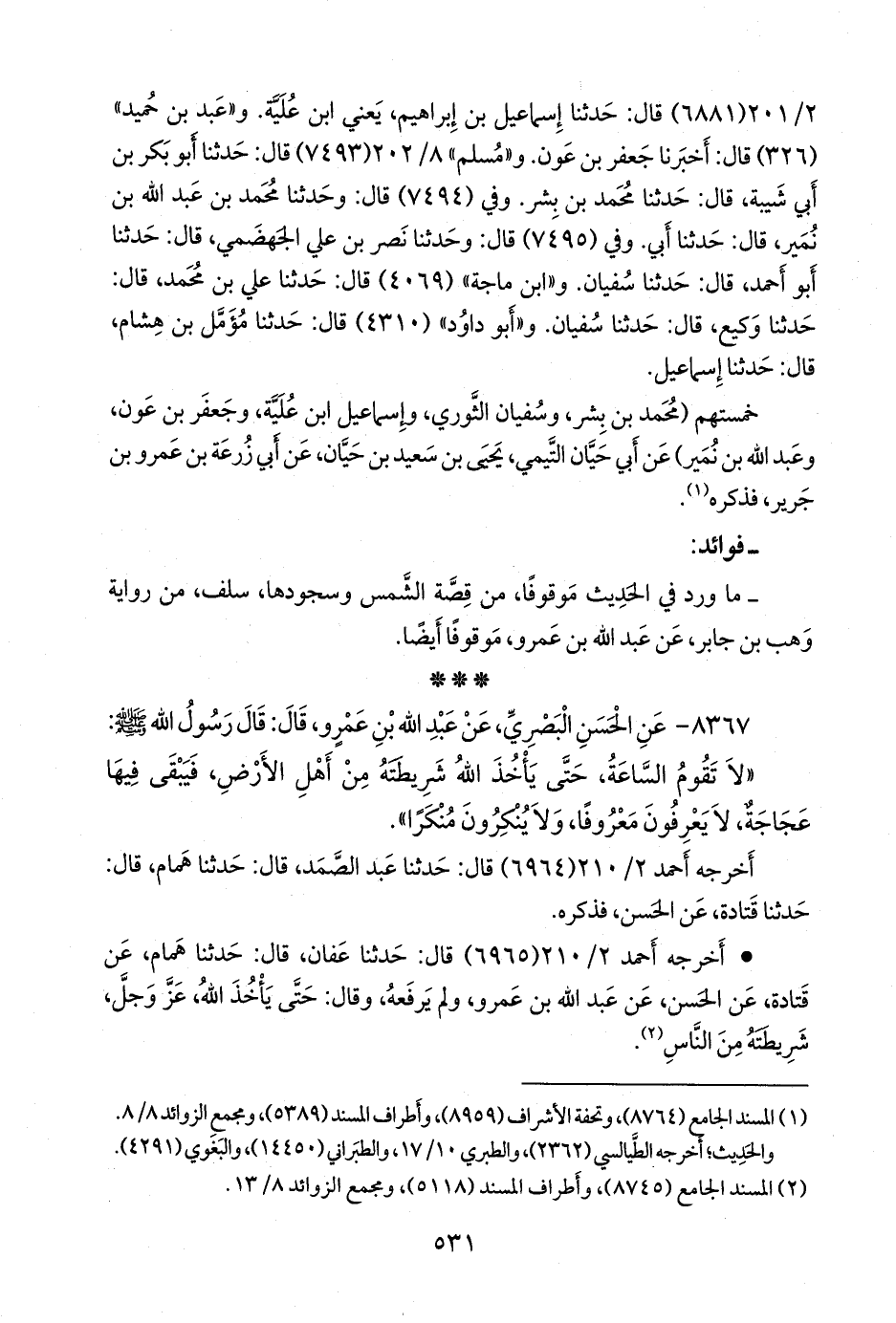 - أَخرجه أحمد (٦٩٦٥) قال: حدثنا عفان، قال: حدثنا همام، عن قتادة، عن الحسن، عن عبد الله بن عَمرو، ولم يرفعه، وقال: حتى يأخذ الله، عز وجل، شريطته من الناس (¬١).
