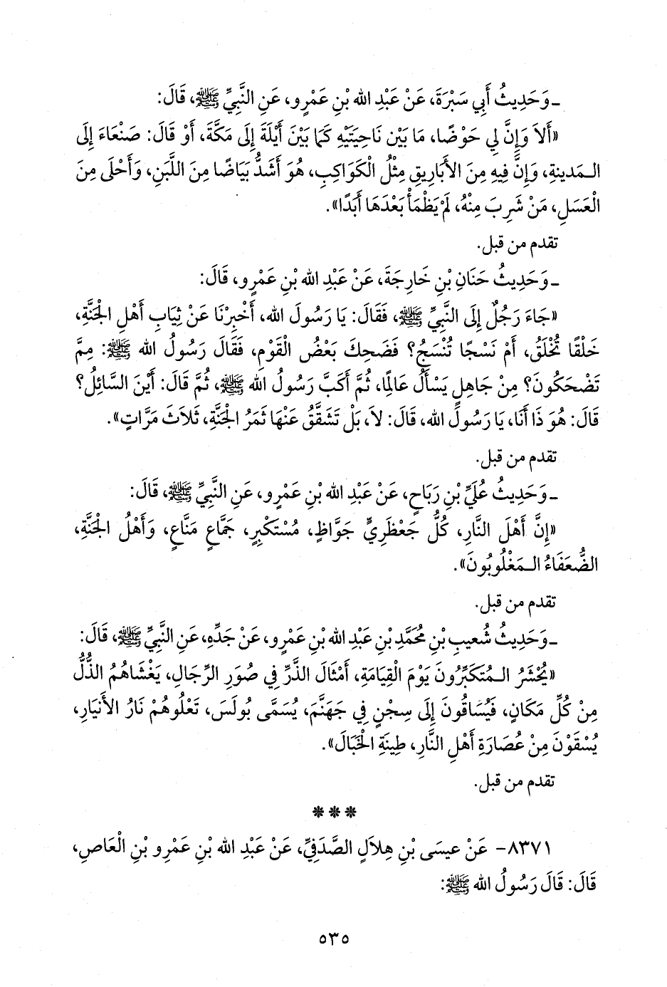 ٨٣٧١ - عن عيسى بن هلال الصدفي، عن عبد الله بن عَمرو بن العاص، قال: قال رسول الله صَلى الله عَليه وسَلم: