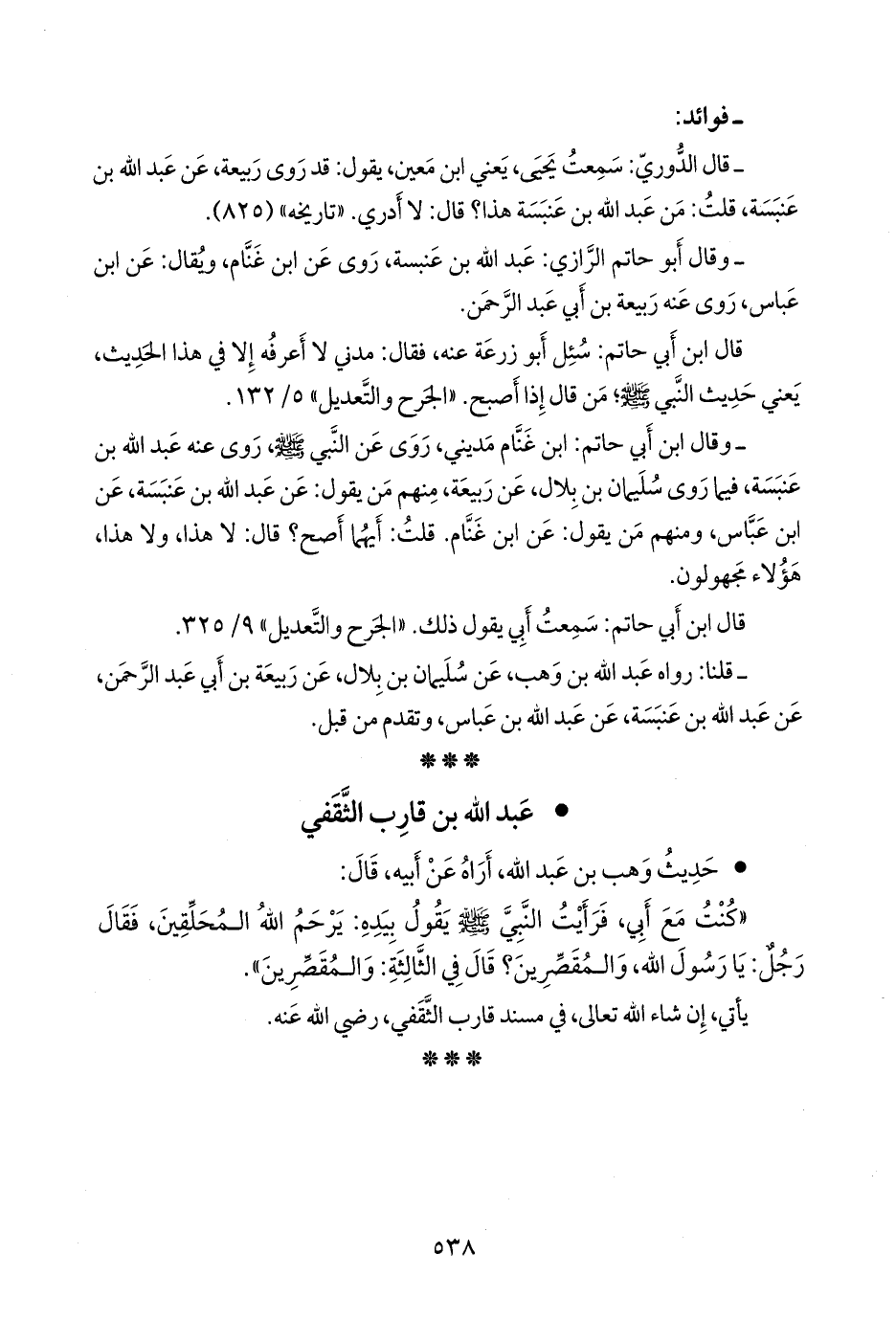 - وقال أَبو حاتم الرازي: عبد الله بن عنبسة، روى عن ابن غنام، ويقال: عن ابن عباس، روى عنه ربيعة بن أبي عبد الرَّحمَن.