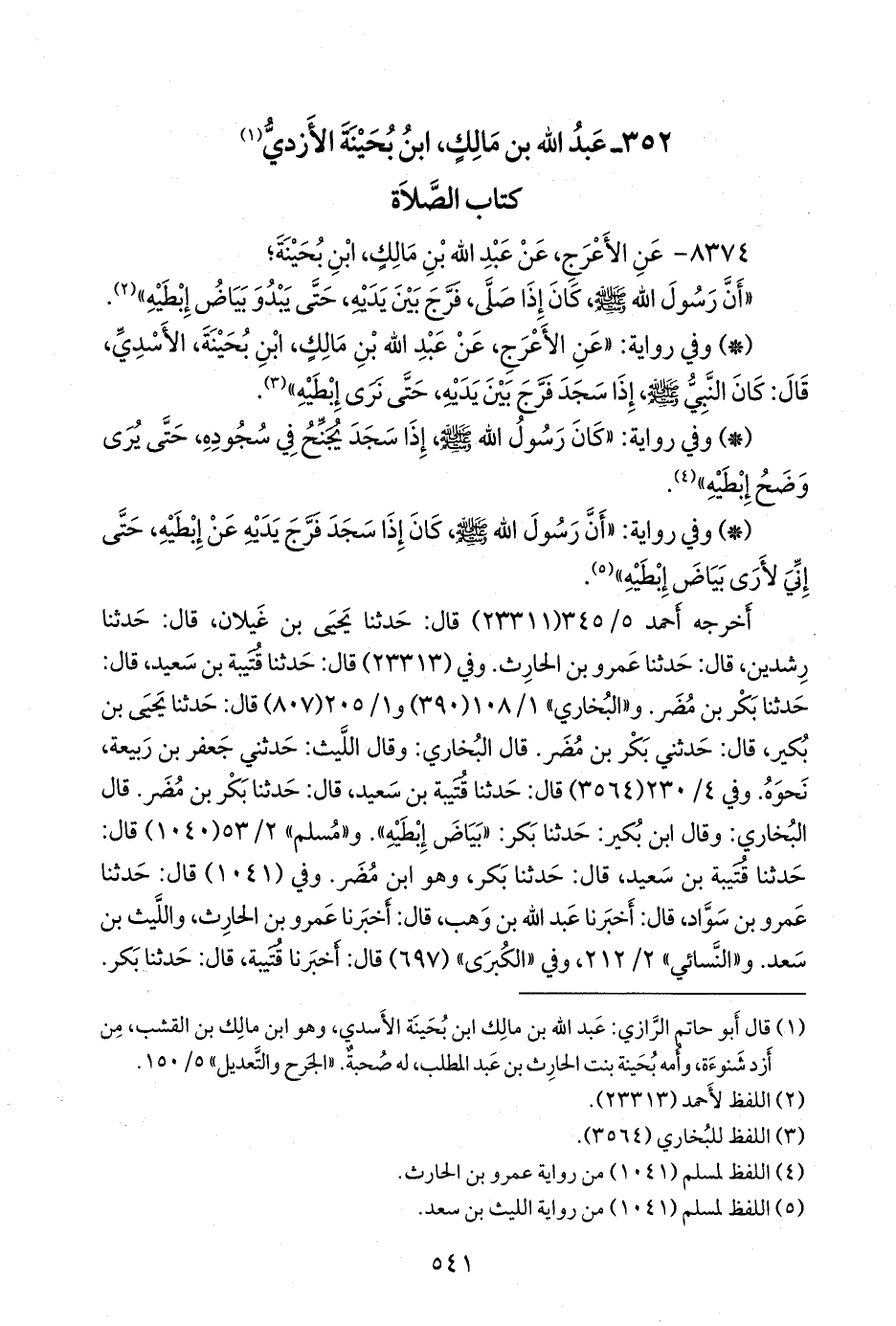 - وفي رواية: «عن الأعرج، عن عبد الله بن مالك، ابن بحينة، الأسدي، قال: كان النبي صَلى الله عَليه وسَلم إذا سجد فرج بين يديه، حتى نرى إبطيه» (¬٣).