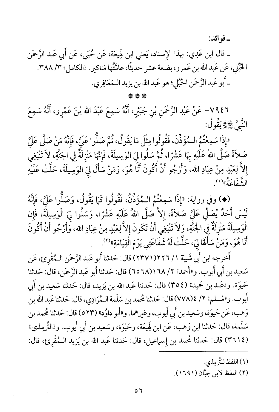 ٧٩٤٦ - عن عبد الرَّحمَن بن جبير، أنه سمع عبد الله بن عَمرو، أنه سمع النبي صَلى الله عَليه وسَلم يقول: