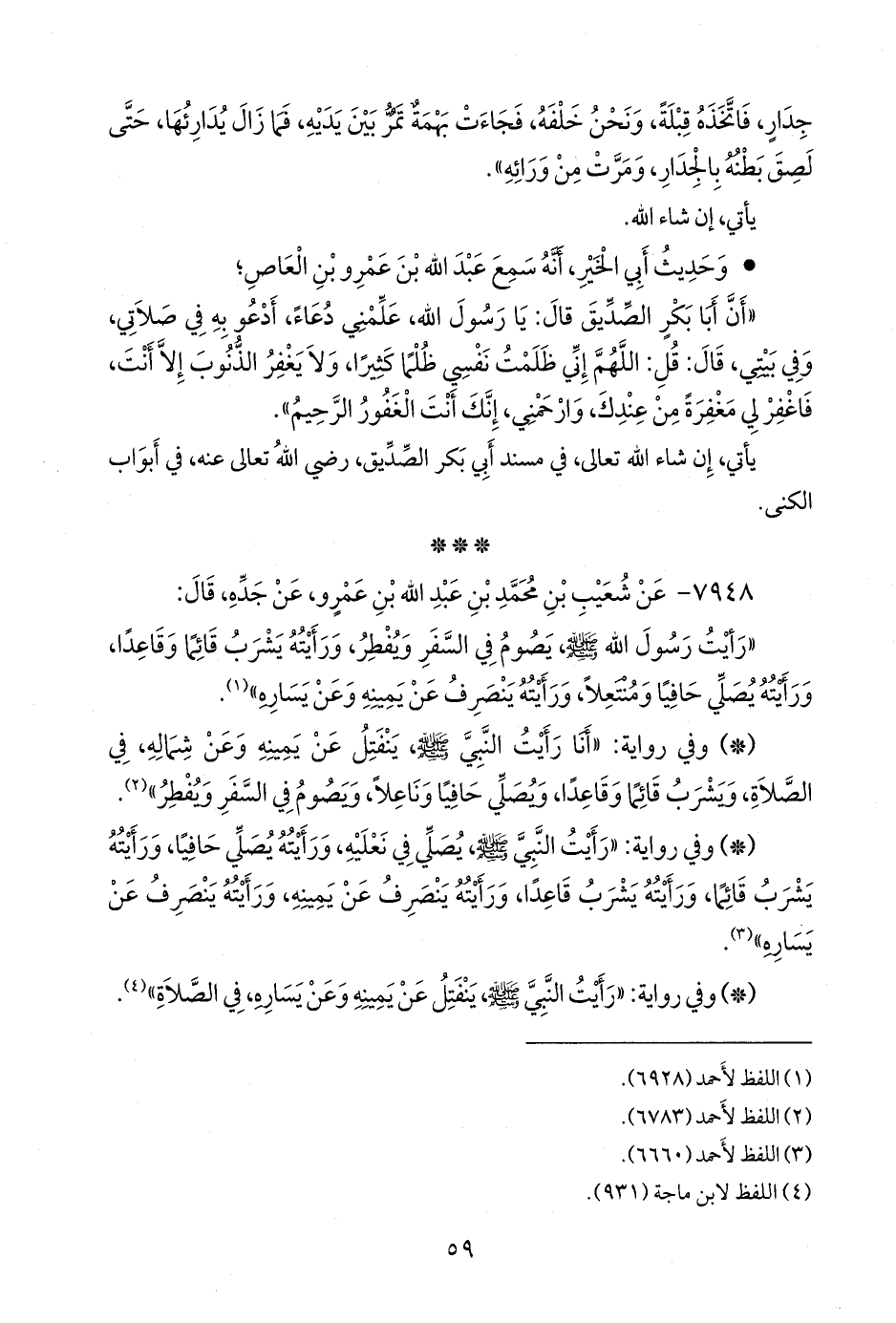- وفي رواية: «رأيت النبي صَلى الله عَليه وسَلم يصلي في نعليه، ورأيته يصلي حافيا، ورأيته يشرب قائما، ورأيته يشرب قاعدا، ورأيته ينصرف عن يمينه، ورأيته ينصرف عن يساره» (¬٣).