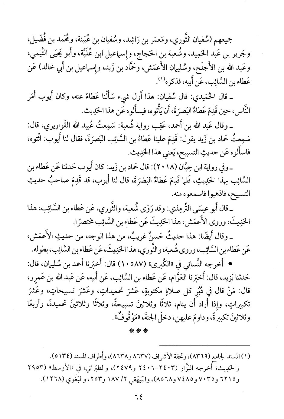 - وقال عبد الله بن أحمد، عقب رواية شعبة: سمعت عُبيد الله القواريري، قال: سمعت حماد بن زيد يقول: قدم علينا عطاء بن السائب البصرة، فقال لنا أيوب: ائتوه، فاسألوه عن حديث التسبيح، يعني هذا الحديث.