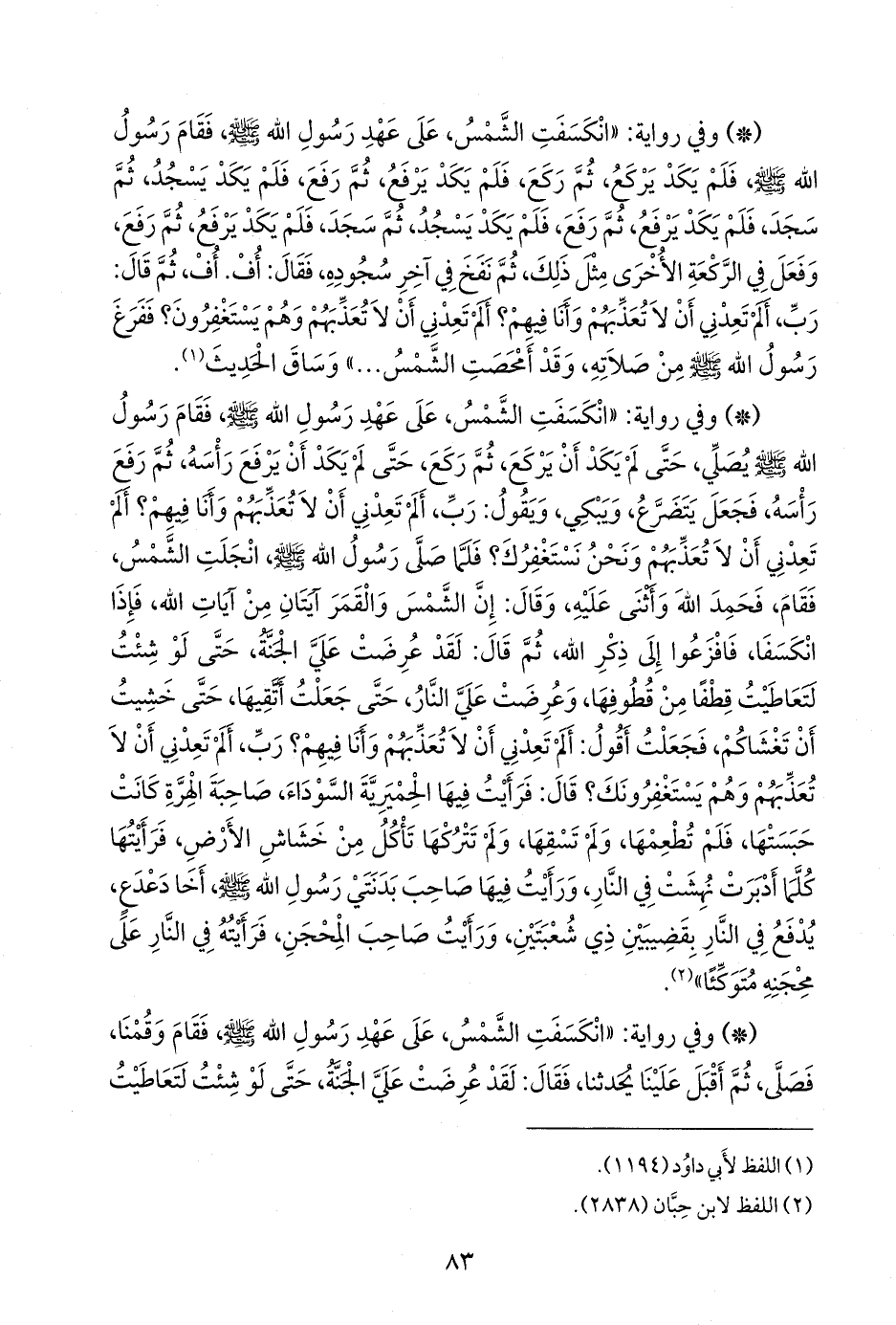 - وفي رواية: «انكسفت الشمس، على عهد رسول الله صَلى الله عَليه وسَلم فقام رسول الله صَلى الله عَليه وسَلم إلى الصلاة، وقام الذين معه، فقام قياما فأطال القيام، ثم ركع فأطال الركوع، ثم رفع رأسه، وسجد فأطال السجود، ثم رفع رأسه، وجلس فأطال الجلوس، ثم سجد فأطال السجود، ثم رفع رأسه وقام، فصنع في الركعة الثانية مثل ما صنع في الركعة الأولى، من القيام والركوع والسجود والجلوس، فجعل ينفخ في آخر سجوده من الركعة الثانية، ويبكي ويقول: لم تعدني هذا وأنا فيهم، لم تعدني هذا ونحن نستغفرك، ثم رفع رأسه، وانجلت الشمس، فقام رسول الله صَلى الله عَليه وسَلم فخطب الناس، فحمد الله، وأثنى عليه، ثم قال: إن الشمس والقمر آيتان من آيات الله، عز وجل، فإذا رأيتم كسوف أحدهما، فاسعوا إلى ذكر الله، عز وجل، والذي نفس محمد بيده، لقد أدنيت الجنة مني، حتى لو بسطت يدي لتعاطيت من قطوفها، ولقد أدنيت النار مني، حتى لقد جعلت أتقيها خشية أن تغشاكم، حتى رأيت فيها امرأة من حمير، تعذب في هرة ربطتها، فلم تدعها تأكل من خشاش الأرض، فلا هي أطعمتها، ولا هي سقتها، حتى ماتت، فلقد رأيتها تنهشها إذا أقبلت، وإذا ولت تنهش أليتها، وحتى رأيت فيها صاحب السبتيتين، أخا بني الدعدع، يدفع بعصا ذات شعبتين في