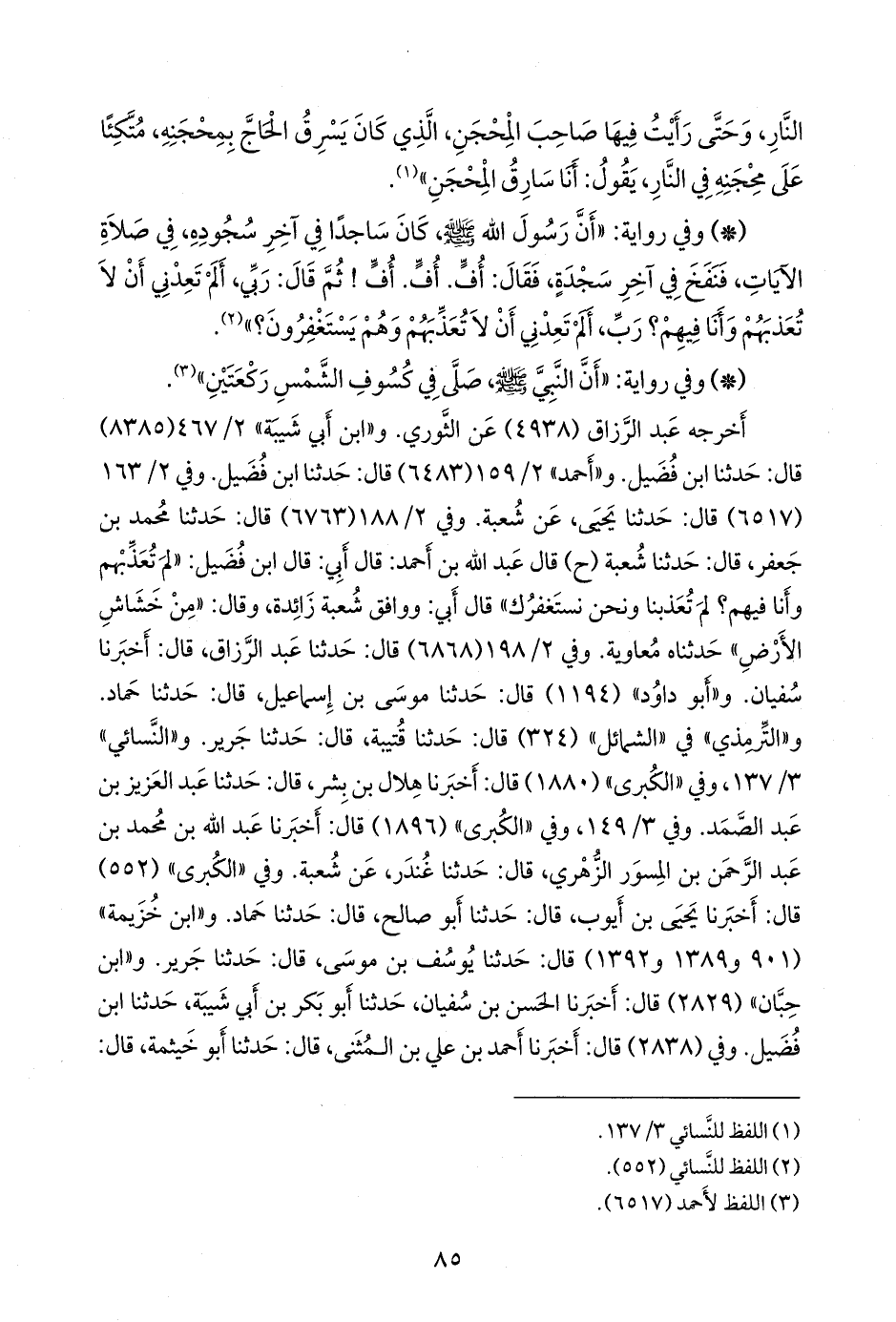 - وفي رواية: «أن رسول الله صَلى الله عَليه وسَلم كان ساجدا في آخر سجوده، في صلاة الآيات، فنفخ في آخر سجدة، فقال: أف. أف. أف! ثم قال: ربي، ألم تعدني أن لا تعذبهم وأنا فيهم؟ رب، ألم تعدني أن لا تعذبهم وهم يستغفرون؟» (¬١).