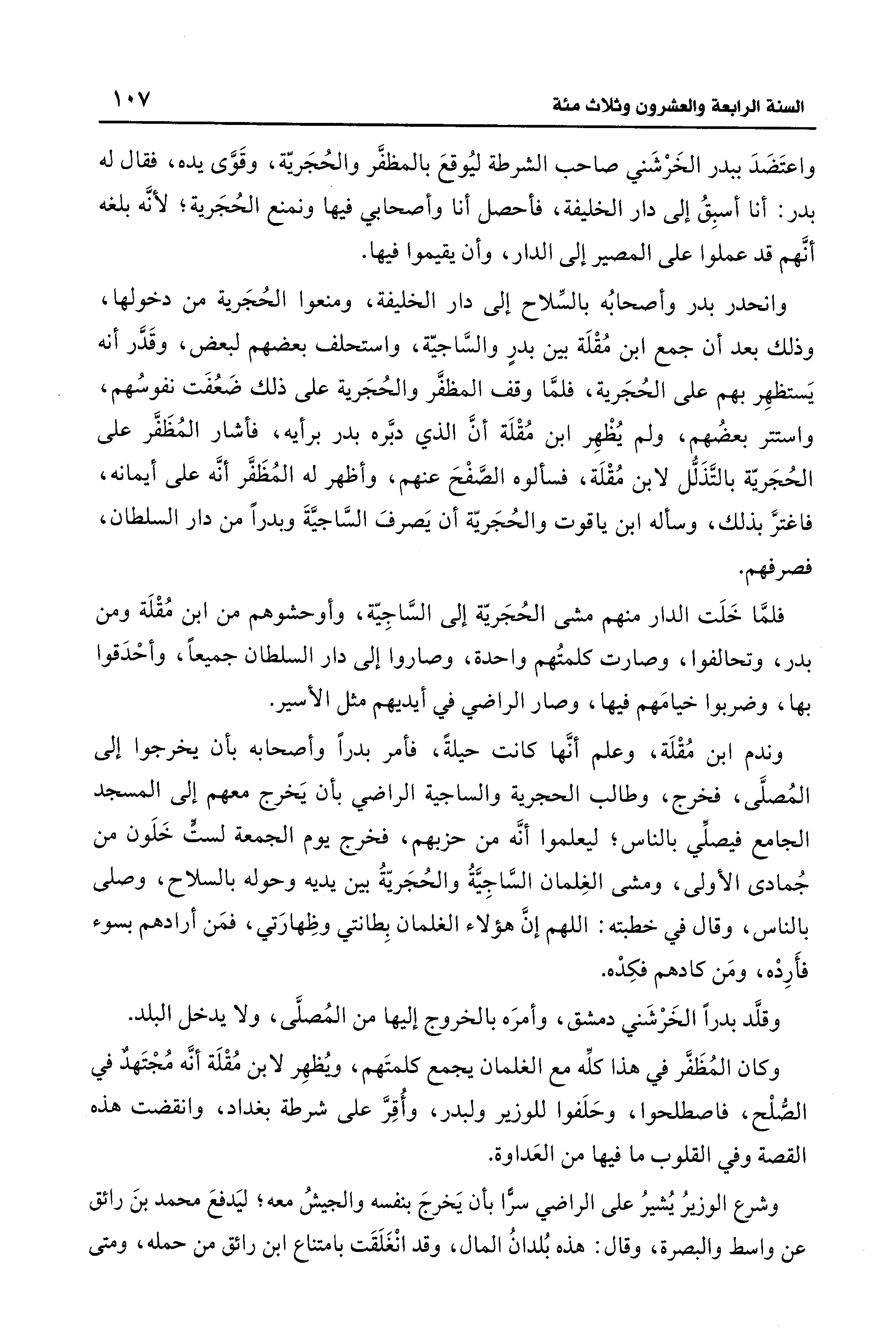 وندم ابن مُقْلَة، وعلم أنَّها كانت حيلةً، فأمر بدرًا وأصحابه بأن يخرجوا إلى المُصلَّى، فخرج، وطالب الحجرية والساجية الراضي بأن يَخرج معهم إلى المسجد الجامع فيصلِّي بالناس؛ ليعلموا أنَّه من حزبهم، فخرج يوم الجمعة لستٍّ خَلَون من جُمادى الأولى، ومشى الغِلمان السَّاجِيَّةُ والحُجَريّةُ بين يديه وحوله بالسلاح، وصلى بالناس، وقال في خطبته: اللهم إنَّ هؤلاء الغلمان بِطانتي وظِهارَتي، فمَن أرادهم بسوء فأَرِدْه، ومَن كادهم فكِدْه.