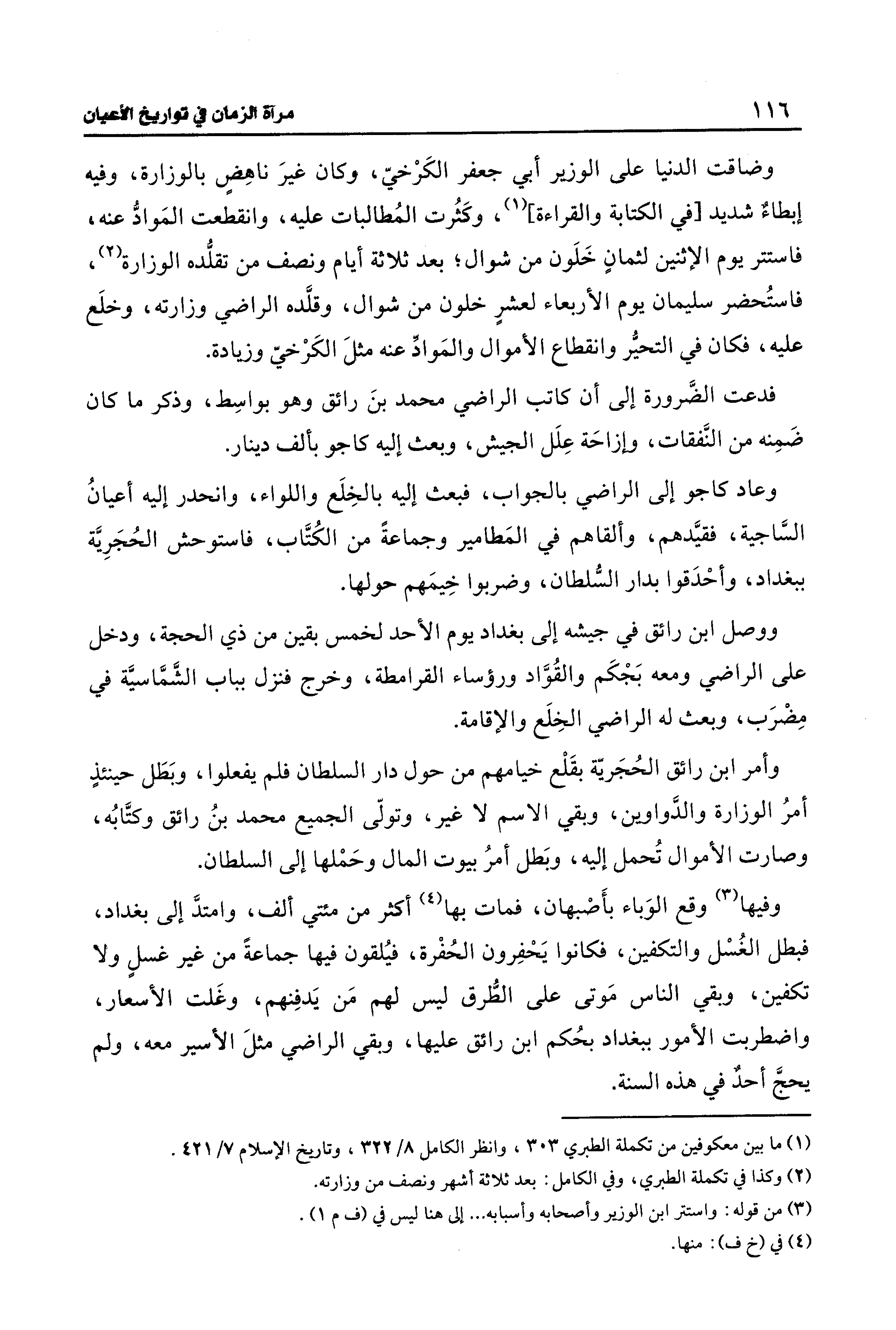 وفيها (¬3) وقع الوَباء بأَصْبهان، فمات بها (¬4) أكثر من مئتي ألف، وامتدَّ إلى بغداد، فبطل الغُسْل والتكفين، فكانوا يَحْفِرون الحُفْرة، فيُلقون فيها جماعةٌ من غير غسلٍ ولا تكفين، وبقي الناس مَوتى على الطُّرق ليس لهم مَن يَدفِنهم، وغَلت الأسعار، واضطربت الأمور ببغداد بحُكم ابن رائق عليها، وبقي الراضي مثلَ الأسير معه، ولم يحجَّ أحدٌ في هذه السنة.