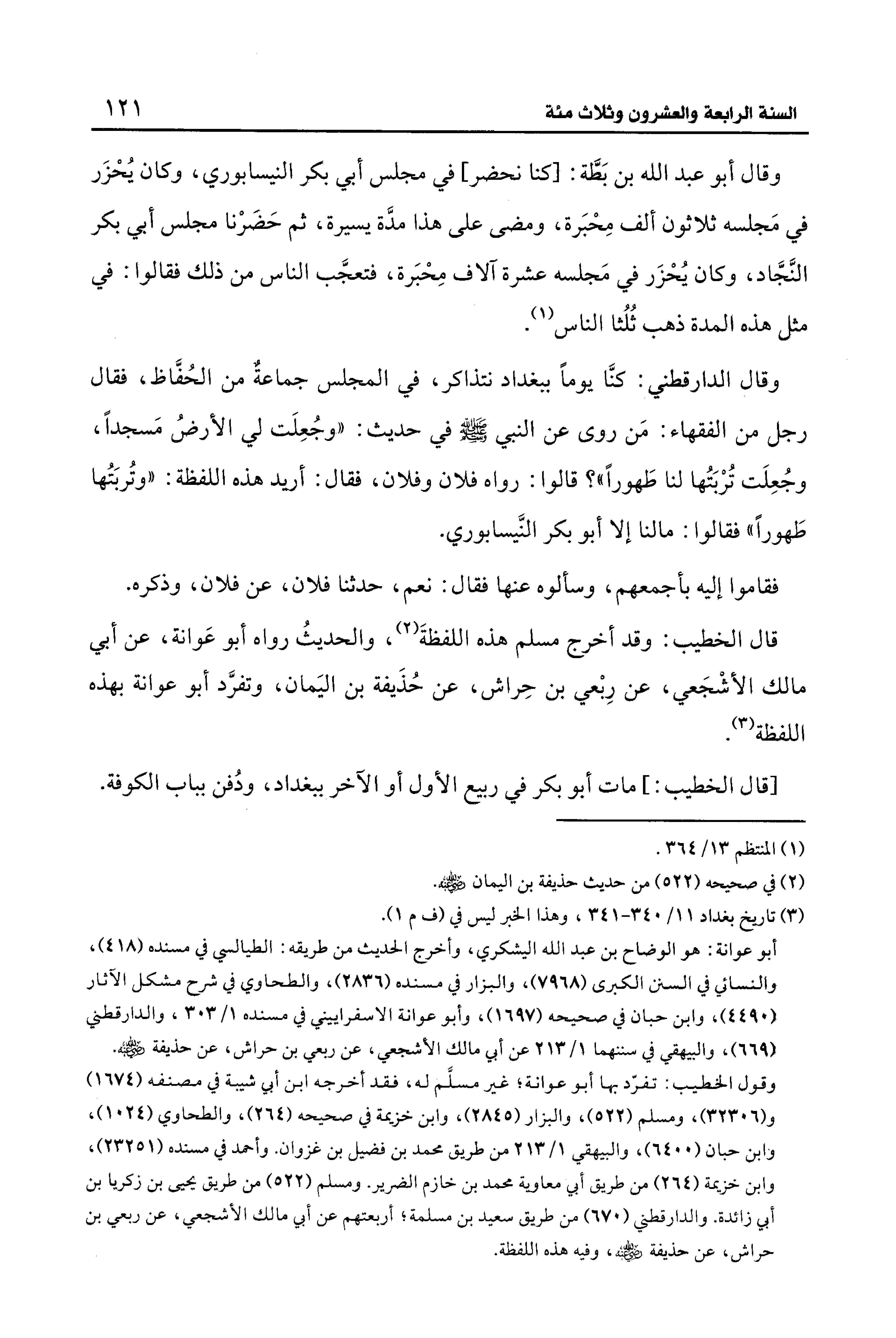 وقال الدارقطني: كنَّا يومًا ببغداد نتذاكر، في المجلس جماعة من الحُفَّاظ، فقال رجل من الفقهاء: مَن روى عن النبي - صلى الله عليه وسلم - في حديث: "وجُعِلَت لي الأرضُ مَسجدًا، وجُعِلَت تُرْبَتُها لنا طَهورًا"؛ قالوا: رواه فلان وفلان، فقال: أريد هذه اللفظة: "وتُربَتُها طَهورًا" فقالوا: ما لنا إلا أبو بكر النَّيسابوري.