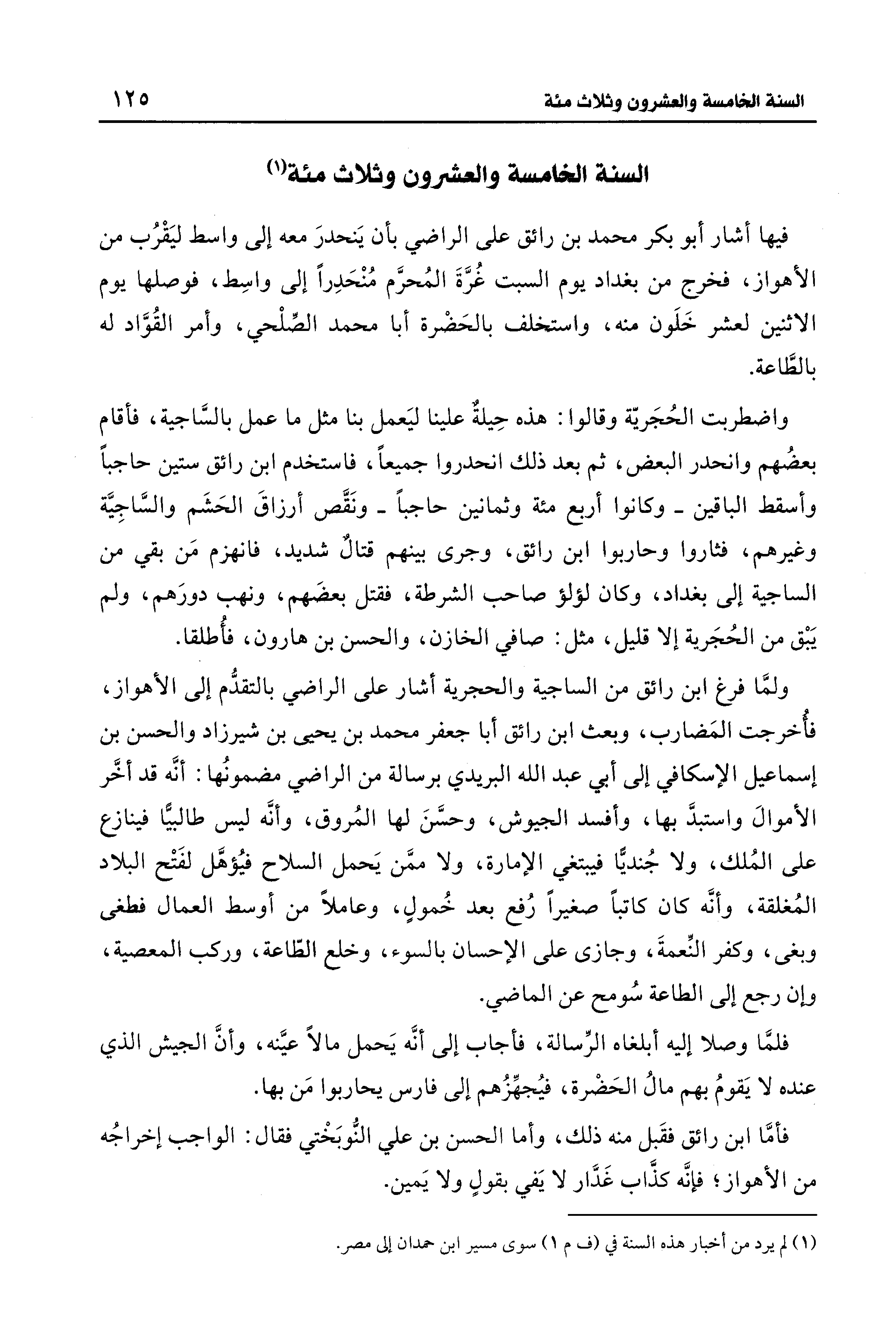 واضطربت الحُجَريّة وقالوا: هذه حِيلةٌ علينا ليَعمل بنا مثل ما عمل بالسَّاجية، فأقام بعضُهم وانحدر البعض، ثم بعد ذلك انحدروا جميعًا، فاستخدم ابن رائق ستين حاجبًا وأسقط الباقين -وكانوا أربع مئة وثمانين حاجبًا- ونَقَّص أرزاقَ الحَشَم والسَّاجِيَّة وغيرهم، فثاروا وحاربوا ابن رائق، وجرى بينهم قتالٌ شديد، فانهزم مَن بقي من الساجية إلى بغداد، وكان لؤلؤ صاحب الشرطة، فقتل بعضَهم، ونهب دورَهم، ولم يَبْق من الحُجَرية إلا قليل، مثل: صافي الخازن، والحسن بن هارون، فأُطلقا.