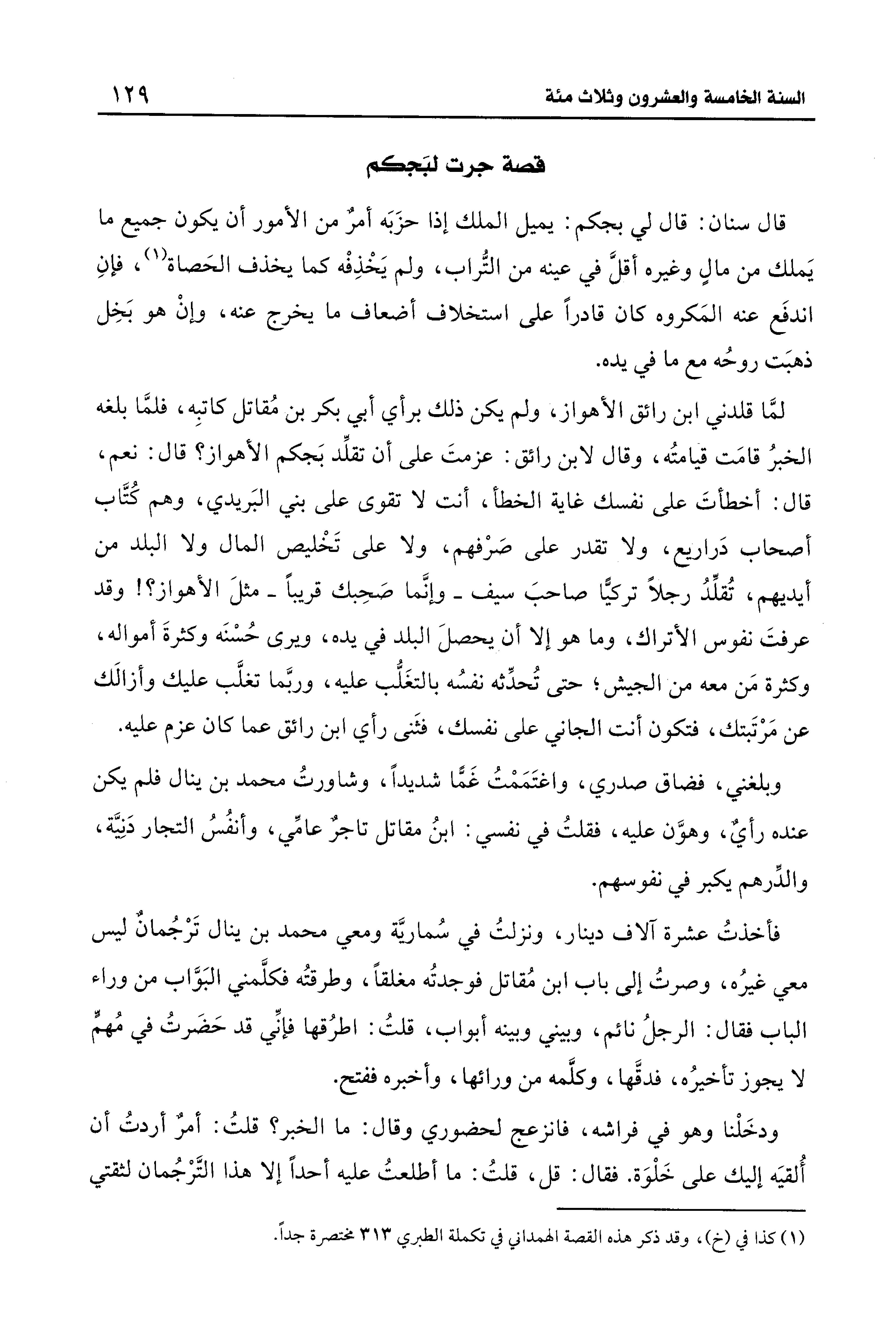 لمَّا قلدني ابن رائق الأهواز، ولم يكن ذلك برأي أبي بكر بن مُقاتل كاتبِه، فلمَّا بلغه الخبرُ قامَت قيامتُه، وقال لابن رائق: عزمتَ على أن تقلِّد بَجكم الأهواز؟ قال: نعم، قال: أخطأتَ على نفسك غاية الخطأ، أنت لا تقوى علي بني البَريدي، وهم كُتَّاب أصحاب دَراريع، ولا تقدر على صَرْفهم، ولا على تَخْليص المال ولا البلد من أيديهم، تُقلِّدُ رجلًا تركيًّا صاحبَ سيف -وإنَّما صحِبك قريبًا- مثلَ الأهواز؟ ! وقد عرفتَ نفوس الأتراك، وما هو إلا أن يحصلَ البلد في يده، ويرى حُسْنَه وكثرةَ أمواله، وكثرة مَن معه من الجيش، حتَّى تُحدِّثه نفسُه بالتغَلُّب عليه، وربَّما تغلَّب عليك وأزالك عن مَرْتَبتك، فتكون أنت الجاني على نفسك، فثَنى رأي ابن رائق عما كان عزم عليه.