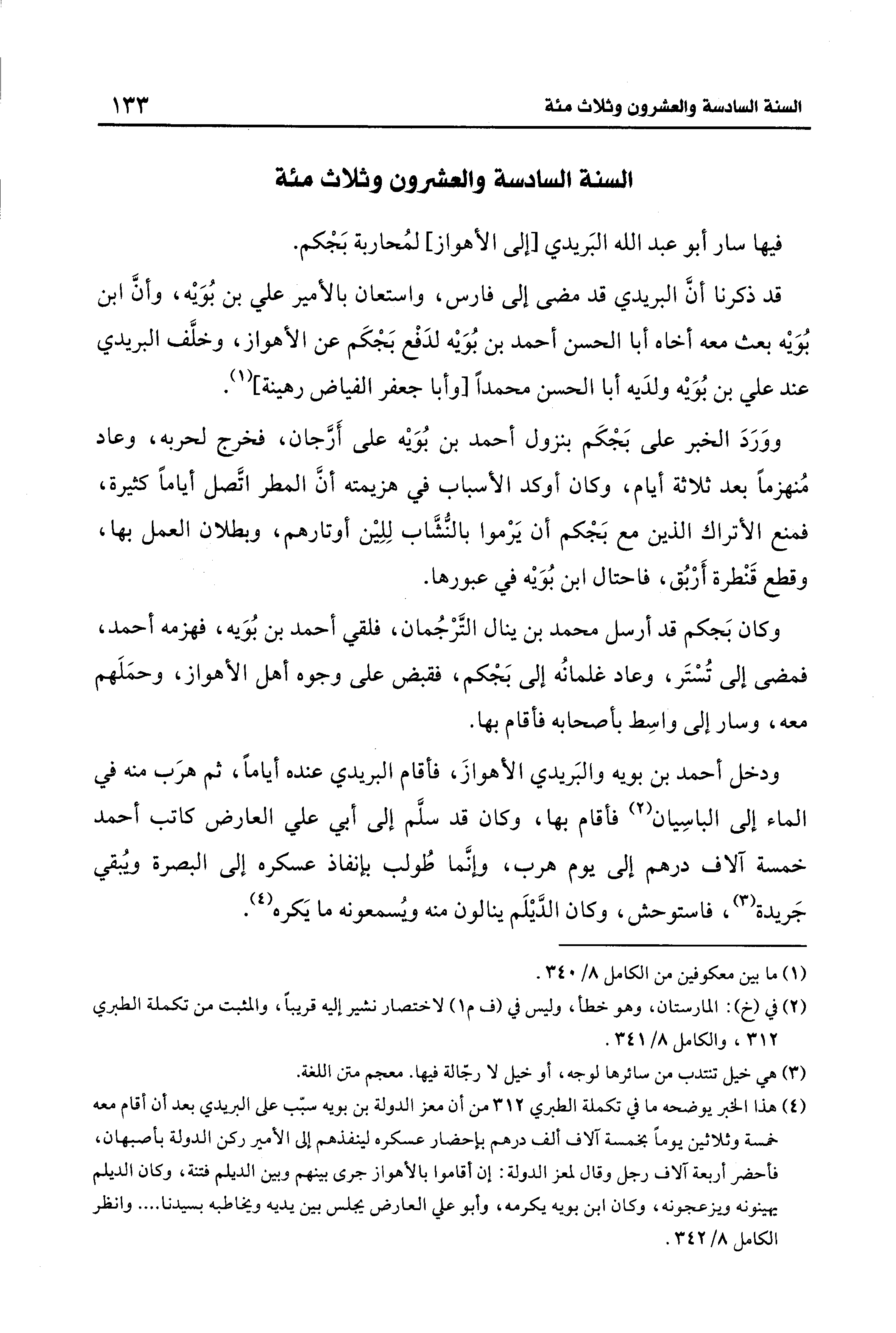 (¬4) هذا الخبر يوضحه ما في تكملة الطبري 312 من أن معز الدولة بن بويه سبّب على البريدي بعد أن أقام معه خمسة وثلاثين يومًا بخمسة آلاف ألف درهم بإحضار عسكره لينفذهم إلى الأمير ركن الدولة بأصبهان، فأحضر أربعة آلاف رجل وقال لمعز الدولة: إن أقاموا بالأهواز جرى بينهم وبين الديلم فتنة، وكان الديلم يهينونه ويزعجونه، وكان ابن بويه يكرمه، وأبو علي العارض يجلس بين يديه ويخاطبه بسيدنا. وانظر الكامل 8/ 342.