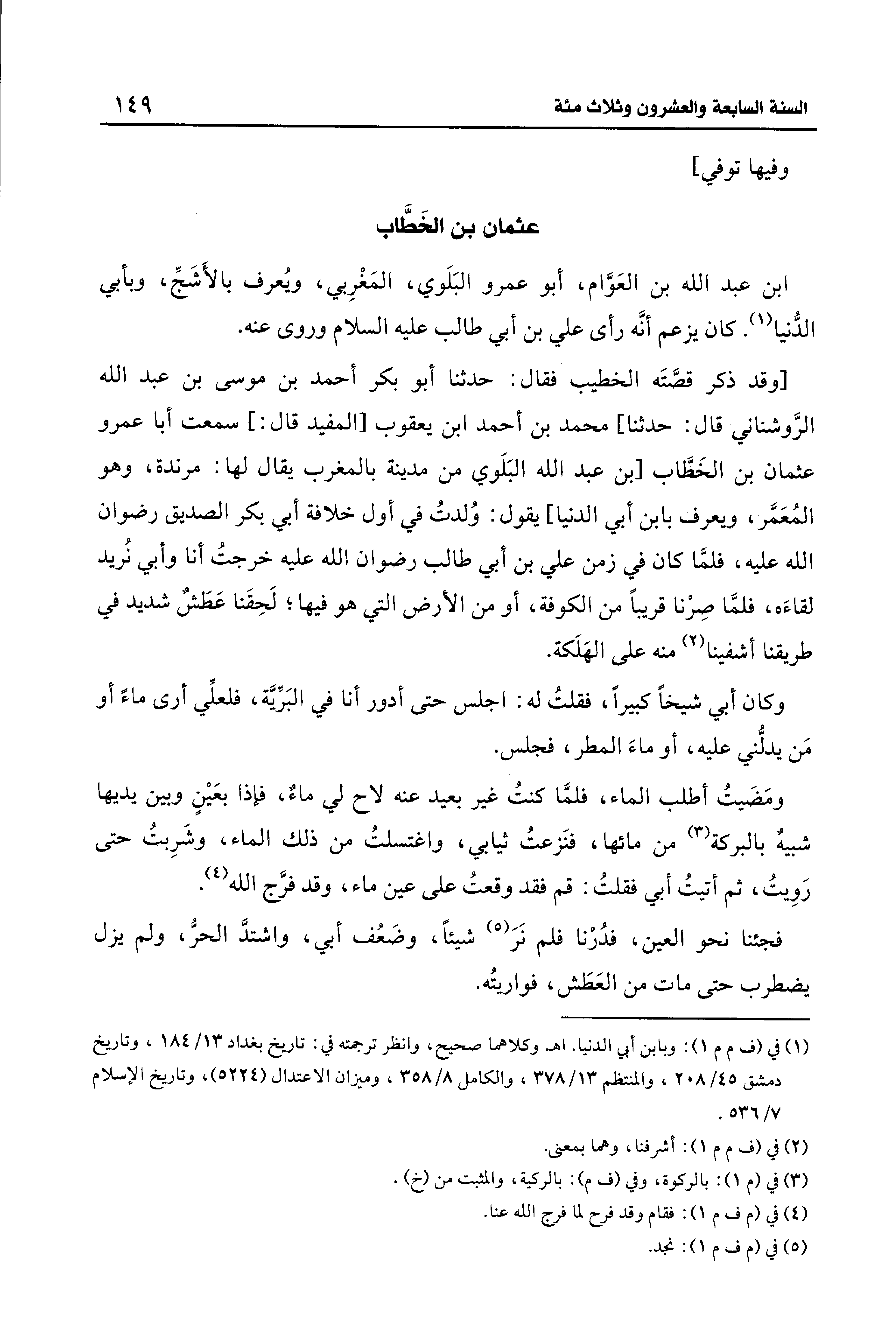 [وقد ذكر قصَّتَه الخطيب فقال: حدثنا أبو بكر أحمد بن موسى بن عبد الله الرَّوشناني قال: حدثنا] محمد بن أحمد بن يعقوب [المفيد قال: ] سمعت أبا عمرو عثمان بن الخَطَّاب [بن عبد الله البَلَوي من مدينة بالمغرب يقال لها: مرندة، وهو المُعَمَّر، ويعرف بابن أبي الدنيا] يقول: وُلدتُ في أول خلافة أبي بكر الصديق رضوان الله عليه، فلمَّا كان في زمن علي بن أبي طالب رضوان الله عليه خرجتُ أنا وأبي نُريد لقاءَه، فلمَّا صِرْنا قريبًا من الكوفة، أو من الأرض التي هو فيها؛ لَحِقَنا عَطَشٌ شديد في طريقنا أشفينا (¬2) منه على الهَلَكة.