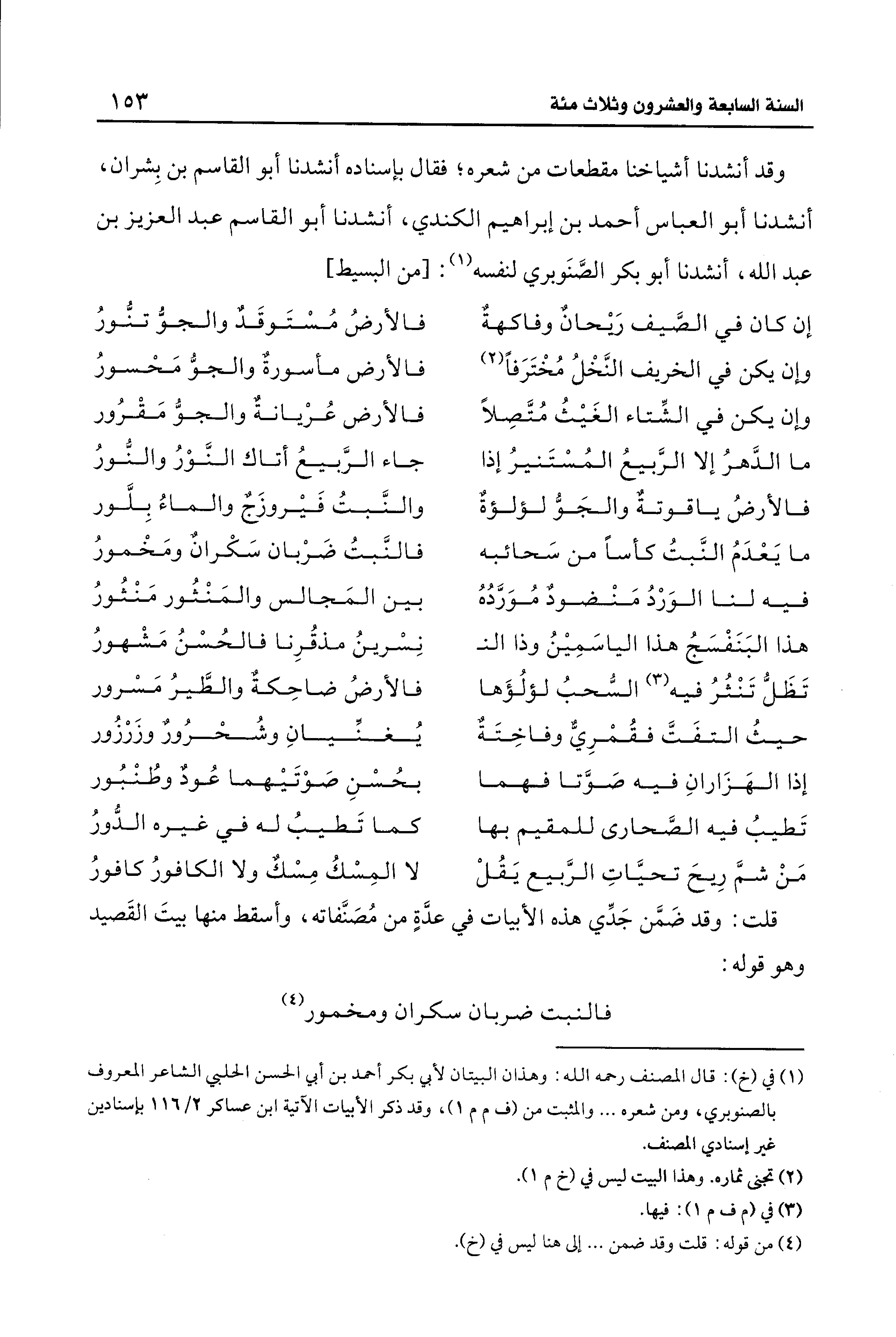 وقد أنشدنا أشياخنا مقطعات من شعره، فقال بإسناده أنشدنا أبو القاسم بن بِشران، أنشدنا أبو العباس أحمد بن إبراهيم الكندي، أنشدنا أبو القاسم عبد العزيز بن عبد الله، أنشدنا أبو بكر الصَّنَوبري لنفسه (¬1): [من البسيط]