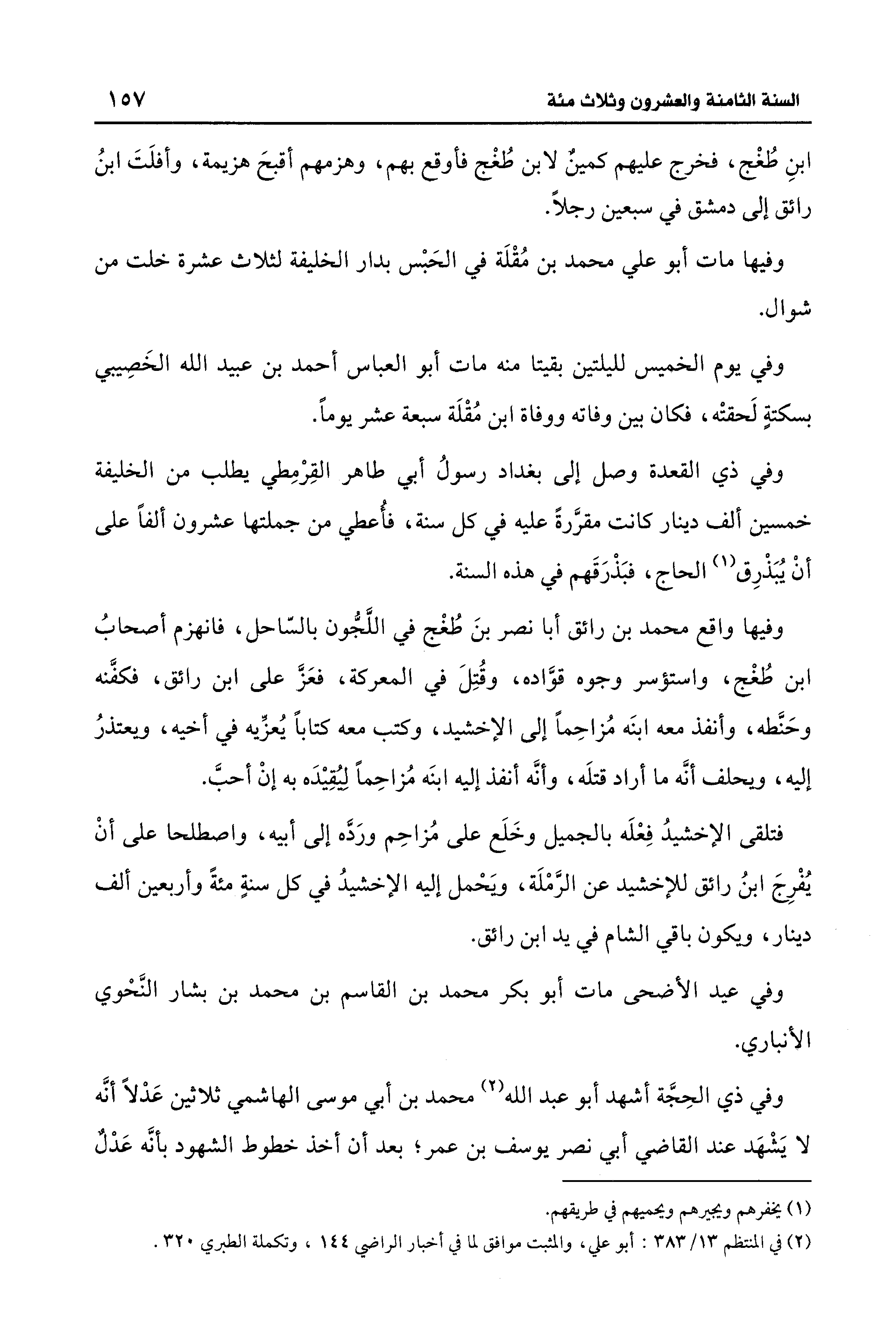 وفيها واقع محمد بن رائق أبا نصر بنَ طُغْج في اللَّجُّون بالسّاحل، فانهزم أصحابُ ابن طُغْج، واستؤسر وجوه قوَّاده، وقُتِلَ في المعركة، فعَزَّ على ابن رائق، فكفَّنه وحَنَّطه، وأنفذ معه ابنَه مُزاحِمًا إلى الإخشيد، وكتب معه كتابًا يُعزِّيه في أخيه، ويعتذرُ إليه، ويحلف أنَّه ما أراد قتلَه، وأنَّه أنفذ إليه ابنَه مُزاحِمًا ليُقِيدَه به إنْ أحبَّ.