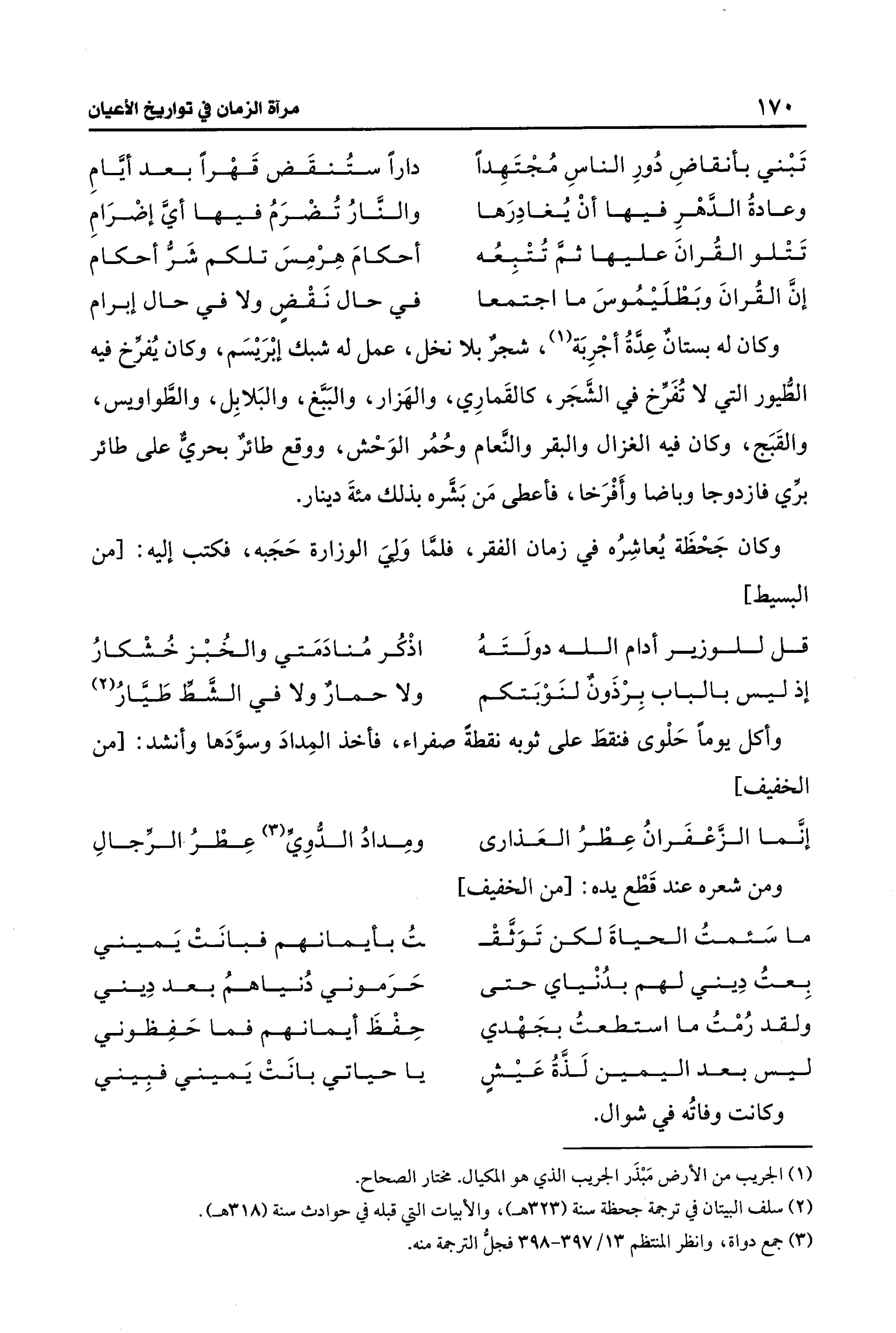 (¬2) سلف البيتان في ترجمة جحظة سنة (323 هـ)، والأبيات التي قبله في حوادث سنة (318 هـ).