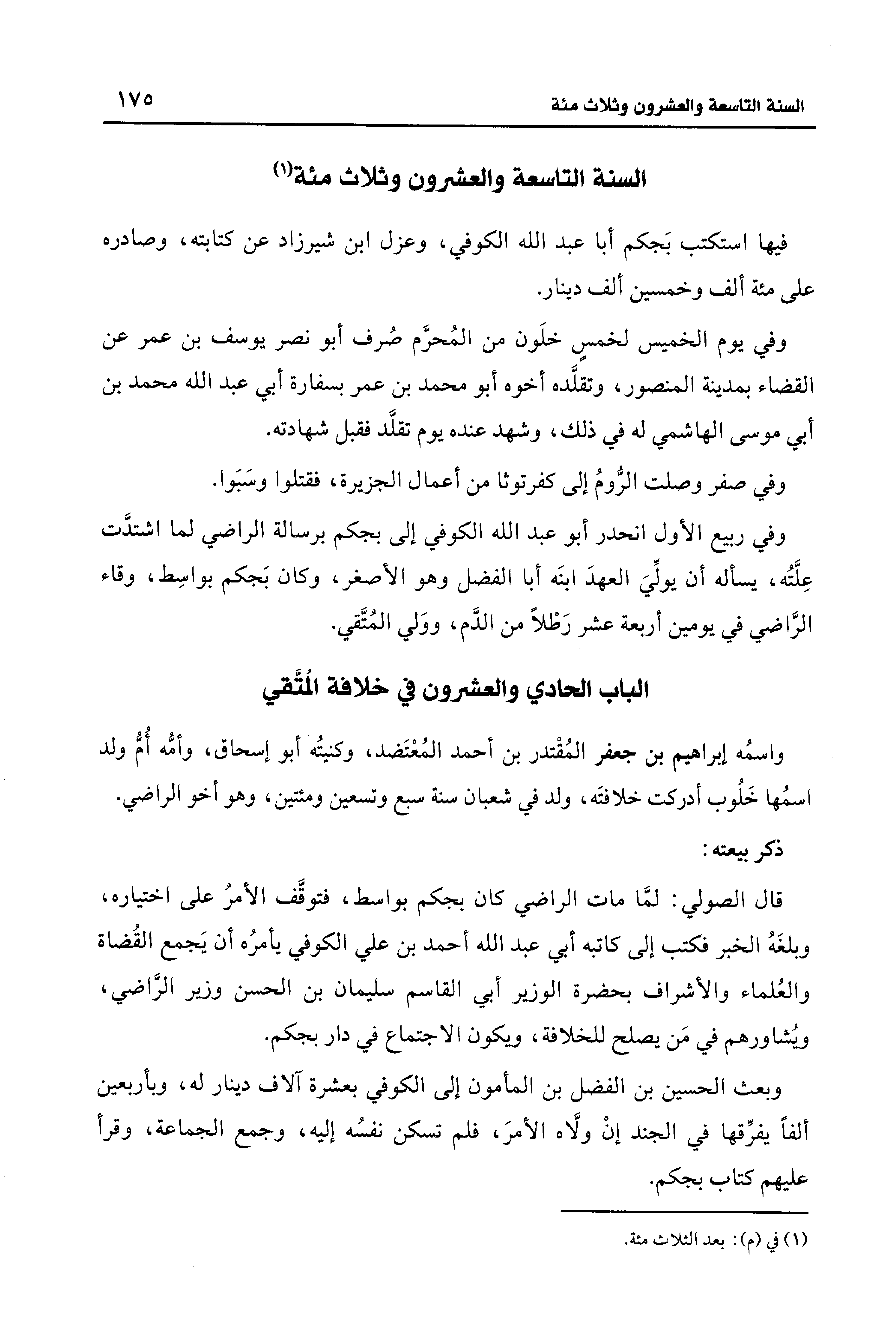 فيها استكتب بَجكم أبا عبد الله الكوفي، وعزل ابن شيرزاد عن كتابته، وصادره على مئة ألف وخمسين ألف دينار.