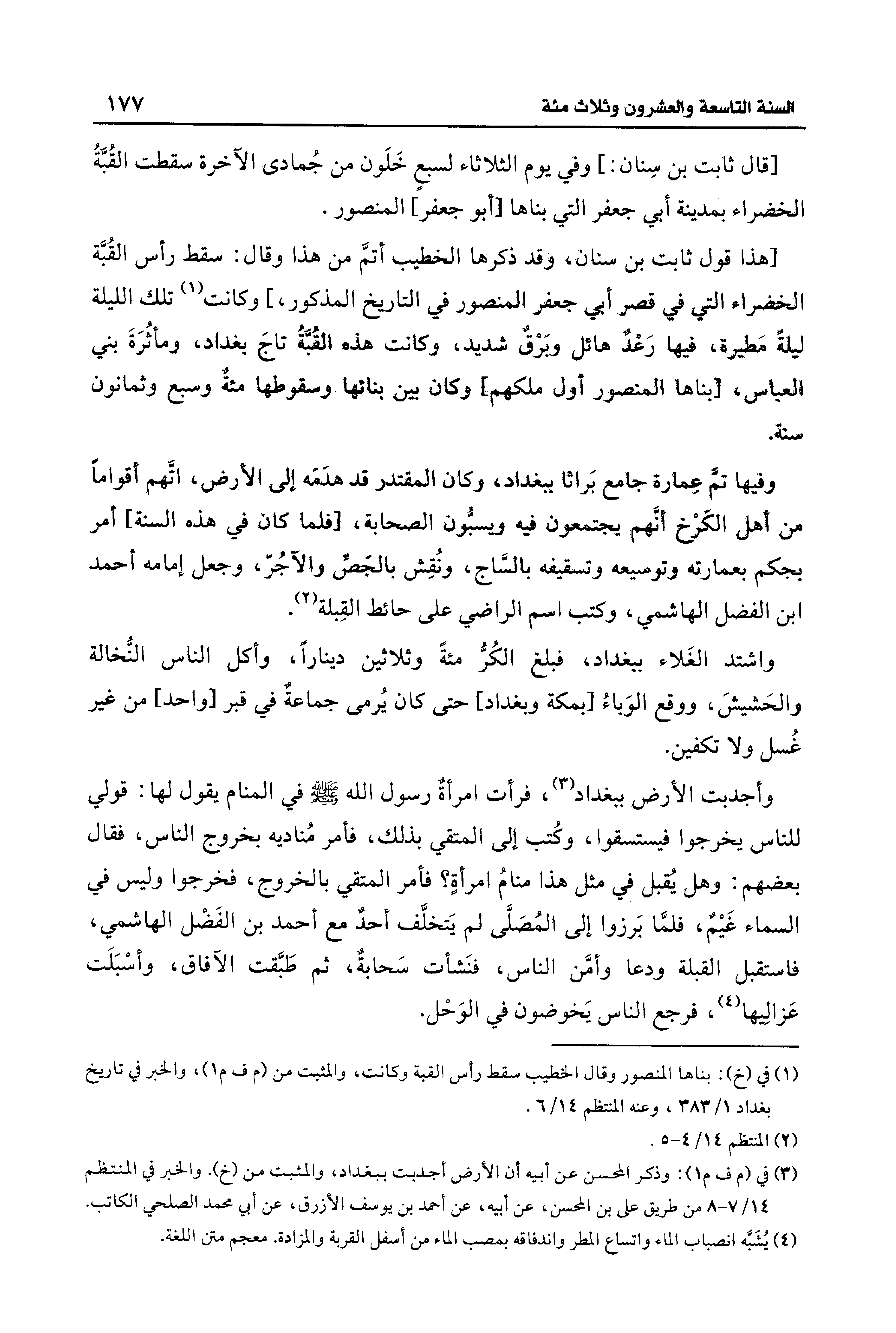 [قال ثابت بن سِنان: ] وفي يوم الثلاثاء لسبعٍ خَلَون من جُمادى الآخرة سقطت القُبَّةُ الخضراء بمدينة أبي جعفر التي بناها [أبو جعفر] المنصور.