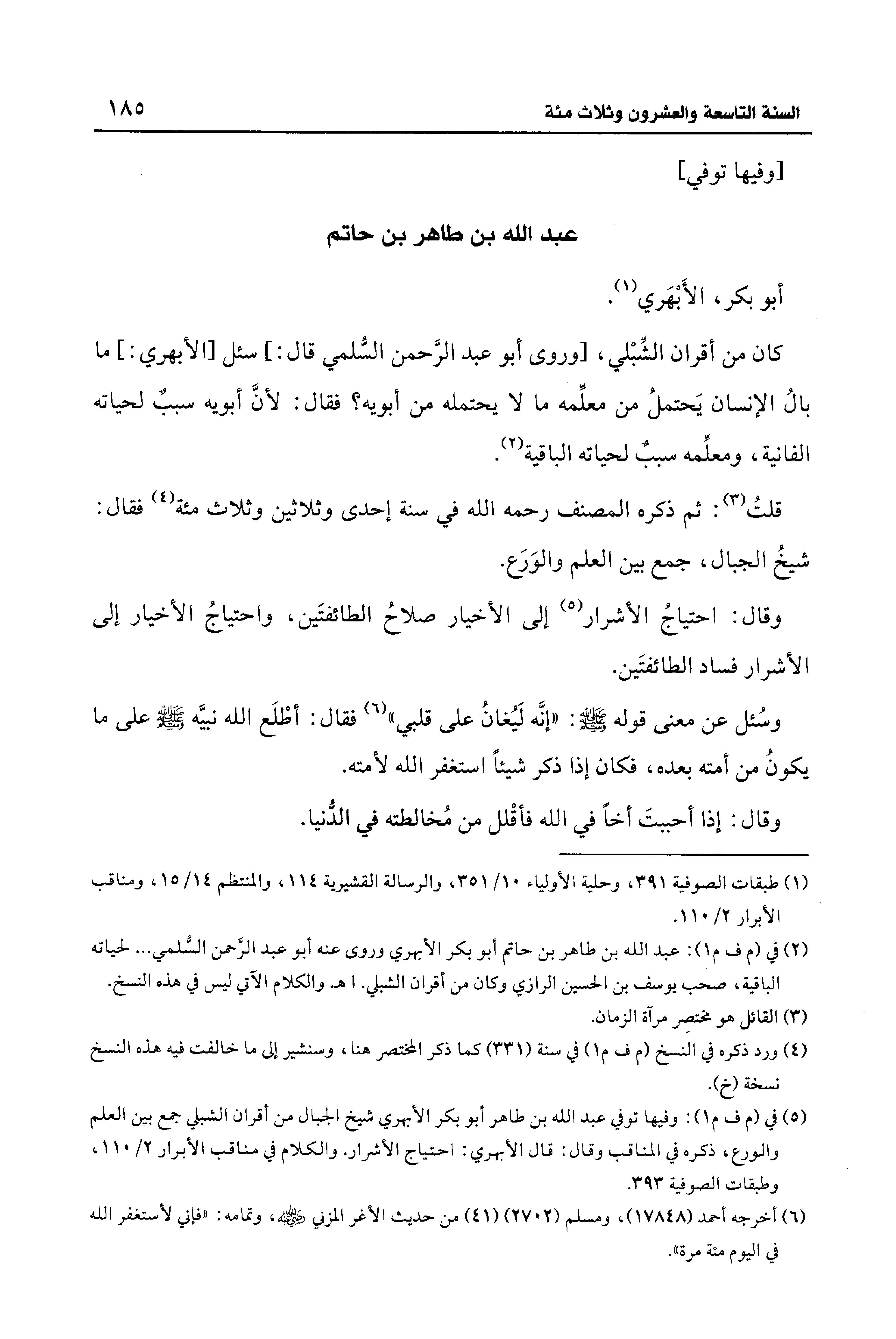 (¬5) في (م ف م 1): وفيها توفي عبد الله بن طاهر أبو بكر الأبهري شيخ الجبال من أقران الشبلي جمع بين العلم والورع، ذكره في المناقب وقال: قال الأبهري: احتياج الأشرار. والكلام في مناقب الأبرار 2/ 110، وطبقات الصوفية 393.