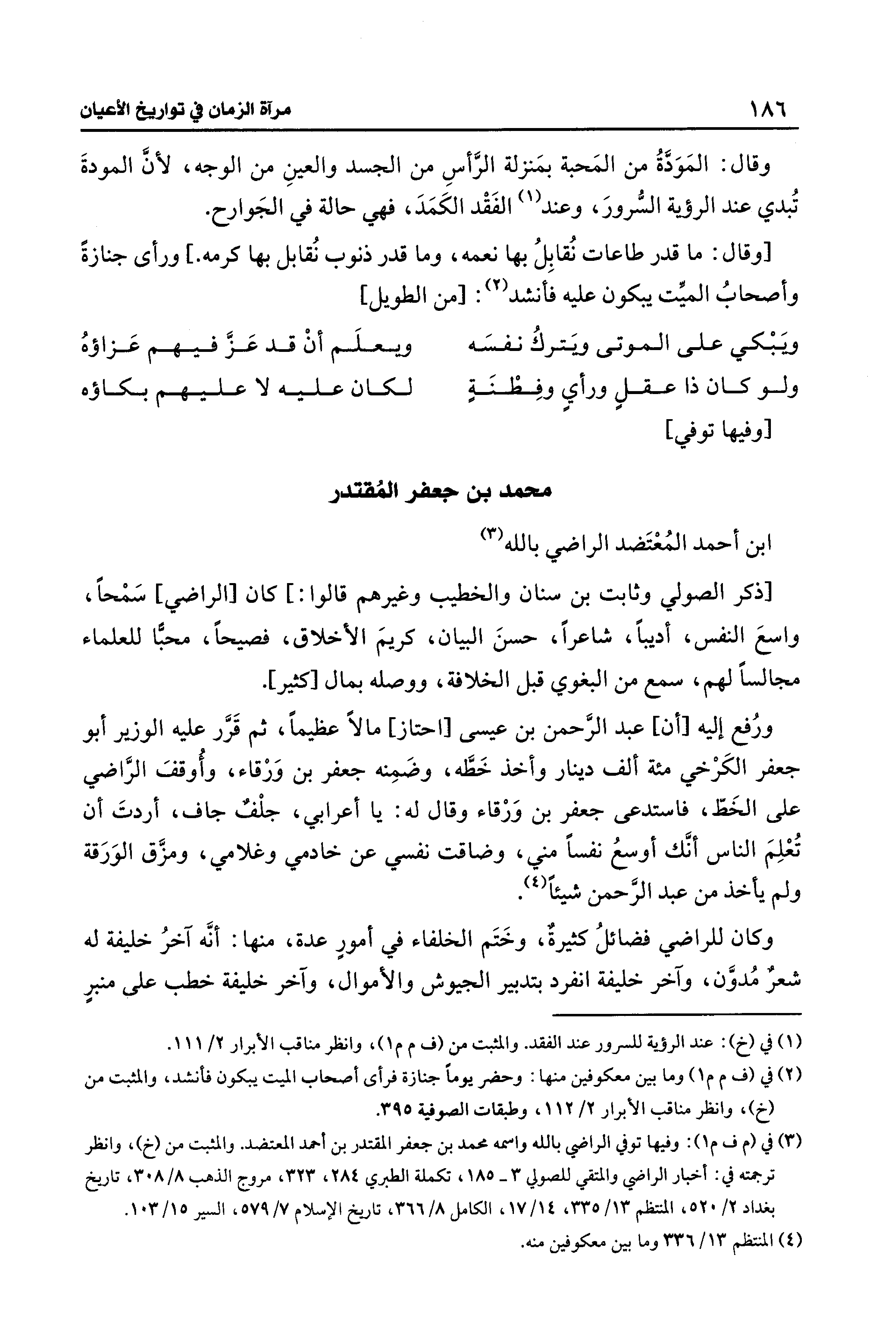 (¬3) في (م ف م 1): وفيها توفي الراضي بالله واسمه محمد بن جعفر المقتدر بن أحمد المعتضد. والمثبت من (خ)، وانظر ترجمته في: أخبار الراضي والمتقي للصولي 3 - 185، تكملة الطبري 284، 323، مروج الذهب 8/ 308، تاريخ بغداد 2/ 520، المنتظم 13/ 335، 14/ 17، الكامل 8/ 366، تاريخ الإسلام 7/ 579، السير 15/ 103.