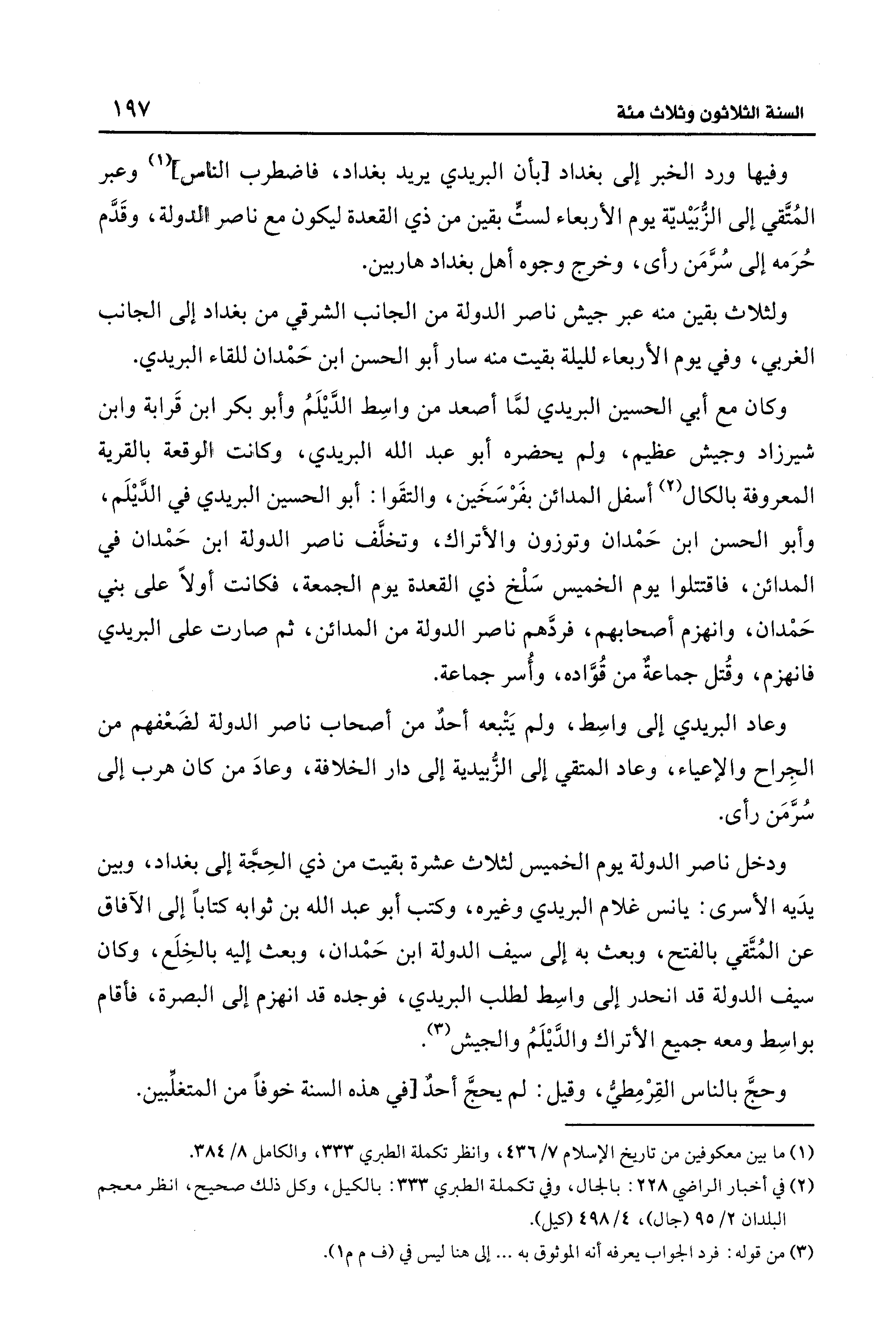 ولثلاث بقين منه عبر جيش ناصر الدولة من الجانب الشرقي من بغداد إلى الجانب الغربي، وفي يوم الأربعاء لليلة بقيت منه سار أبو الحسن بن حمْدان للقاء البريدي.