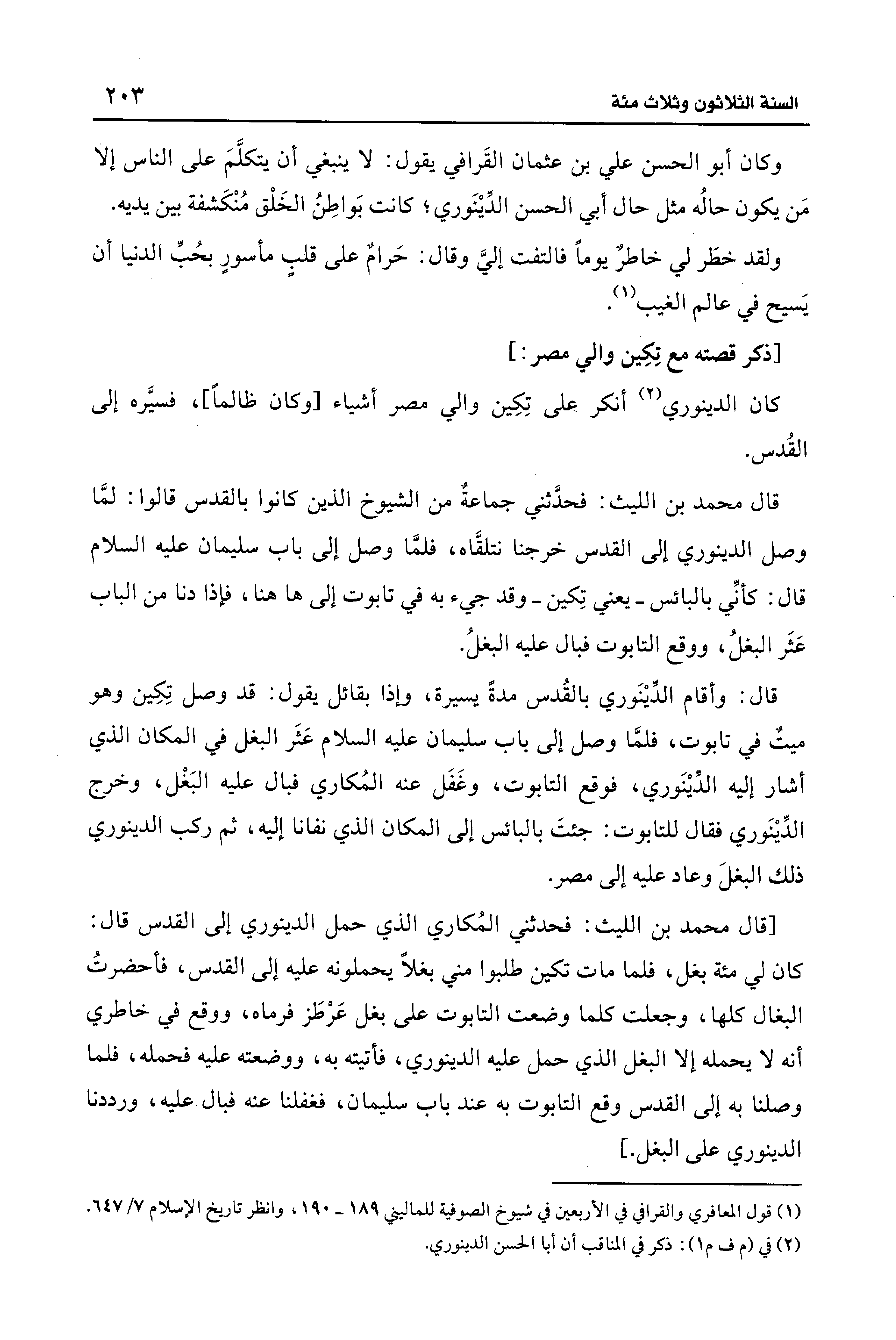 [قال محمد بن الليث: فحدثني المُكاري الذي حمل الدينوري إلى القدس قال: كان في مئة بغل، فلما مات تكين طلبوا مني بغلًا يحملونه عليه إلى القدس، فأحضرتُ البغال كلها، وجعلت كما وضعت التابوت على بغل عَرطَز فرماه، ووقع في خاطري أنه لا يحمله إلا البغل الذي حمل عليه الدينوري، فأتيته به، ووضعته عليه فحمله، فلما وصلنا به إلى القدس وقع التابوت به عند باب سليمان، فغفلنا عنه فبال عليه، ورددنا الدينوري على البغل.]