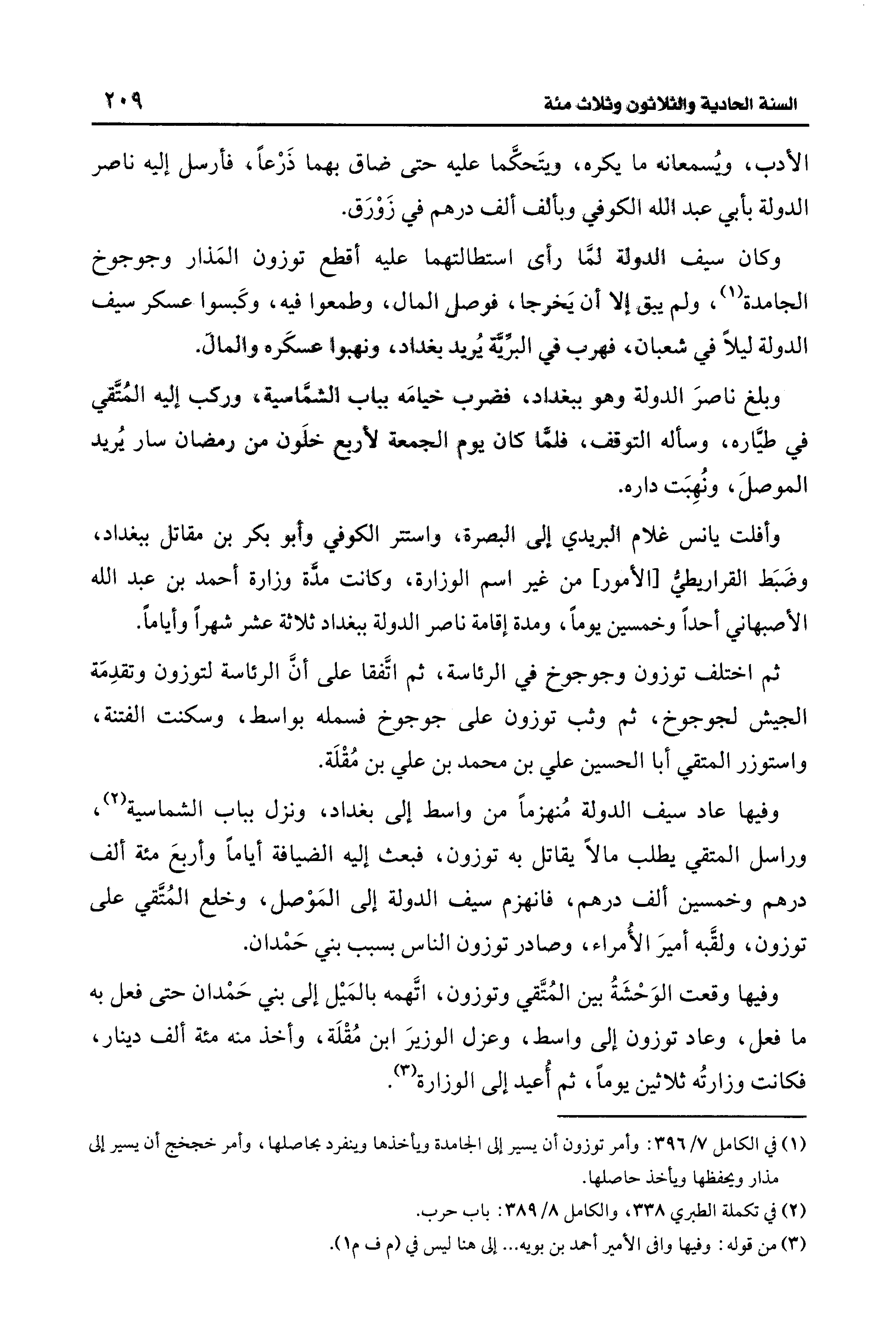 (¬1) في الكامل 7/ 396: وأمر توزون أن يسير إلى الجامدة ويأخذها وينفرد بحاصلها، وأمر خجخج أن يسير إلى مذار ويحفظها ويأخذ حاصلها.