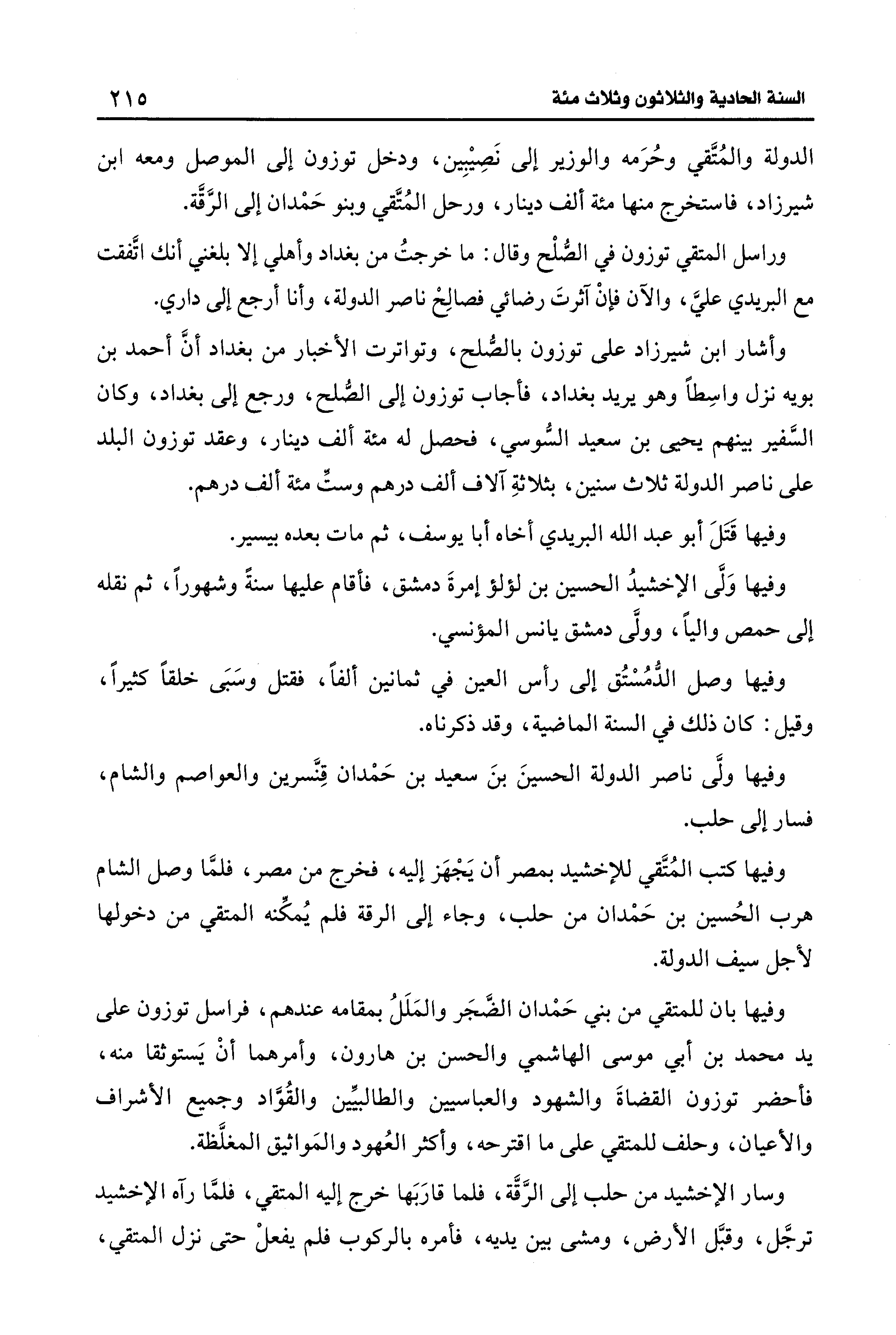 وفيها بان للمتقي من بني حَمْدان الضَّجَر والمَلَلُ بمقامه عندهم، فراسل توزون على يد محمد بن أبي موسى الهاشمي والحسن بن هارون، وأمرهما أنْ يَستوثقا منه، فأحضر توزون القضاةَ والشهود والعباسيين والطالبيِّين والقُوَّاد وجميع الأشراف والأعيان، وحلف للمتقي على ما اقترحه، وأكثر العُهود والمَواثيق المغلَّظة.