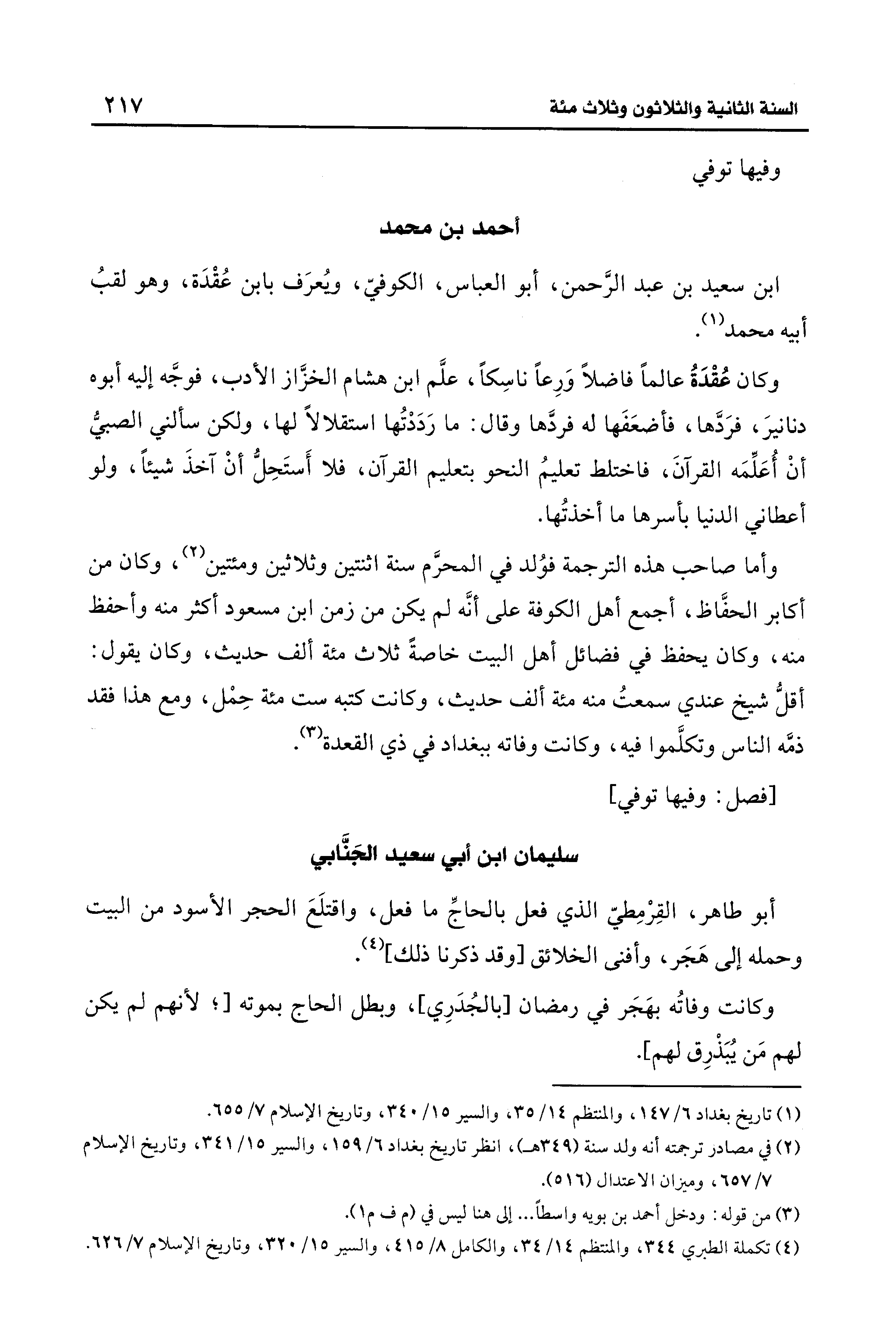 (¬4) تكملة الطبري 344، والمنتظم 14/ 34، والكامل 8/ 415، والسير 15/ 320، وتاريخ الإسلام 7/ 626.