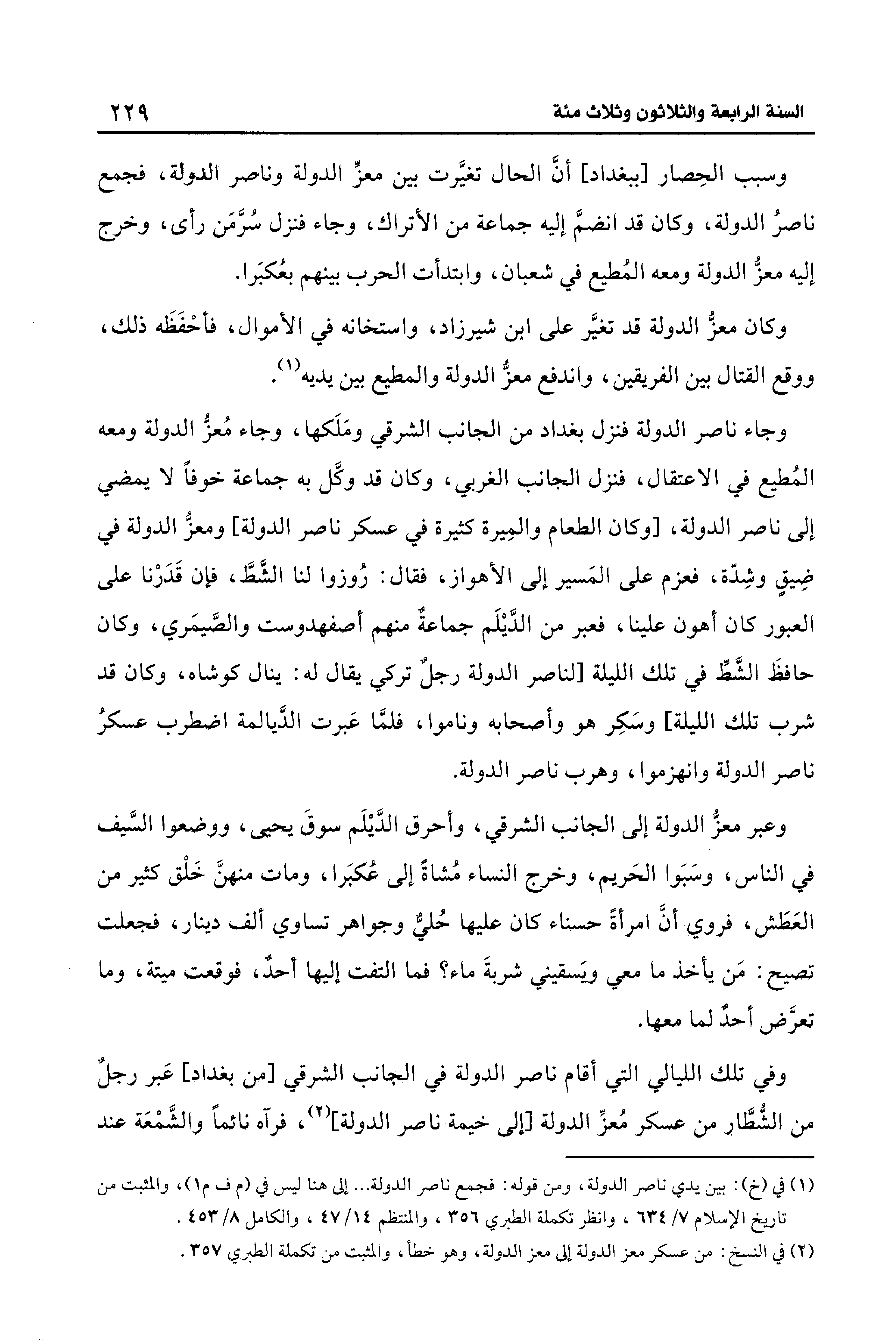 وجاء ناصر الدولة فنزل بغداد من الجانب الشرقي ومَلَكها، وجاء مُعزُّ الدولة ومعه المُطيع في الاعتقال، فنزل الجانب الغربي، وكان قد وكَّل به جماعة خوفًا لا يمضي إلى ناصر الدولة، [وكان الطعام والمِيرة كثيرة في عسكر ناصر الدولة] ومعزُّ الدولة في ضِيقٍ وشِدّة، فعزم على المَسير إلى الأهواز، فقال: رُوزوا لنا الشَّطَّ، فإن قَدَرْنا على العبور كان أهون علينا، فعبر من الدَّيلَم جماعةٌ منهم أصفهدوست والصَّيمَري، وكان حافظَ الشَّطِّ في تلك الليلة [لناصر الدولة رجلٌ تركي يقال له: ينال كوشاه، وكان قد شرب تلك الليلة] وسَكِر هو وأصحابه وناموا، فلمَّا عَبرت الدَّيالمة اضطرب عسكرُ ناصر الدولة وانهزموا، وهرب ناصر الدولة.