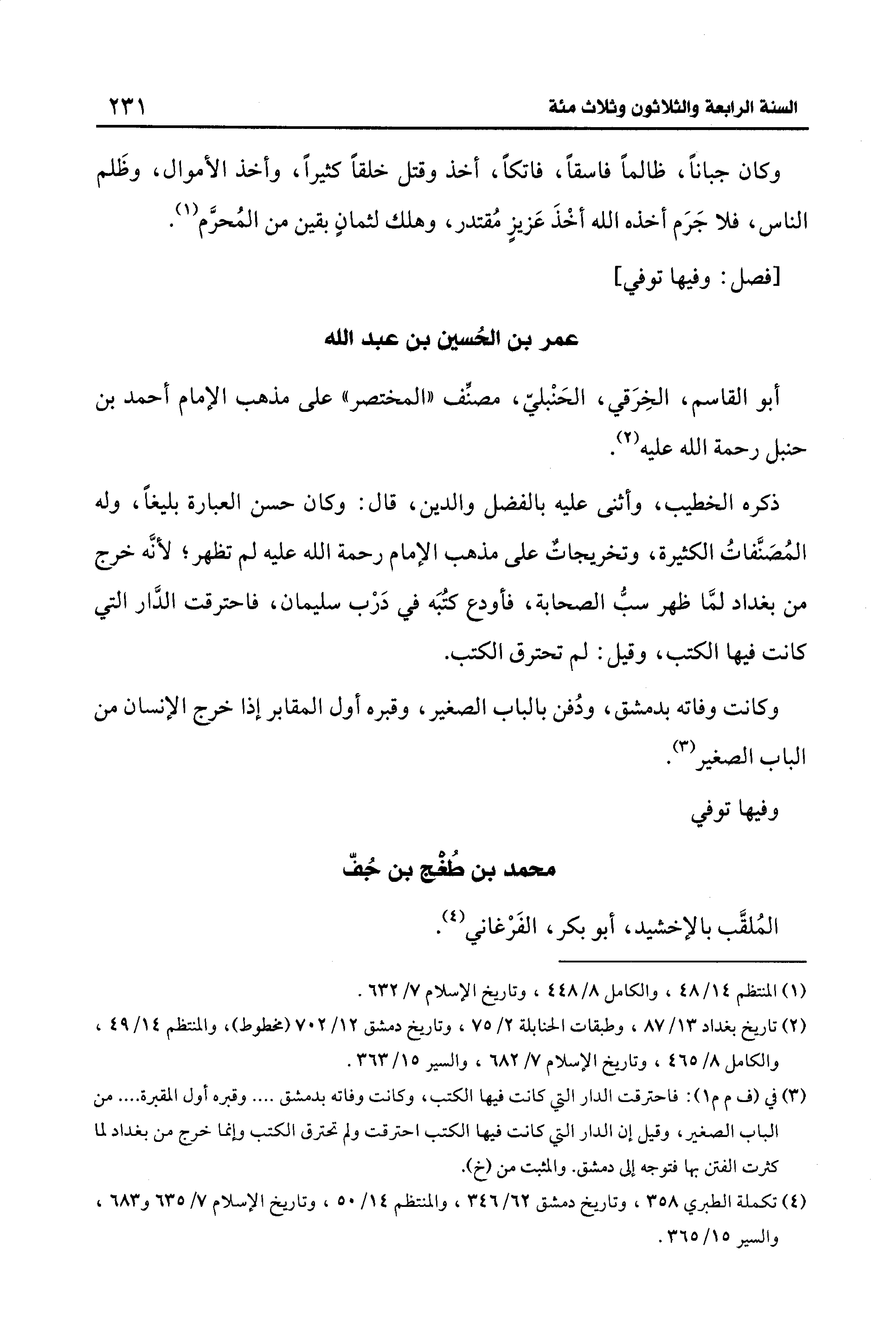 (¬4) تكملة الطبري 358، وتاريخ دمشق 62/ 346، والمنتظم 14/ 50، وتاريخ الإسلام 7/ 635 و 683، والسير 15/ 365.