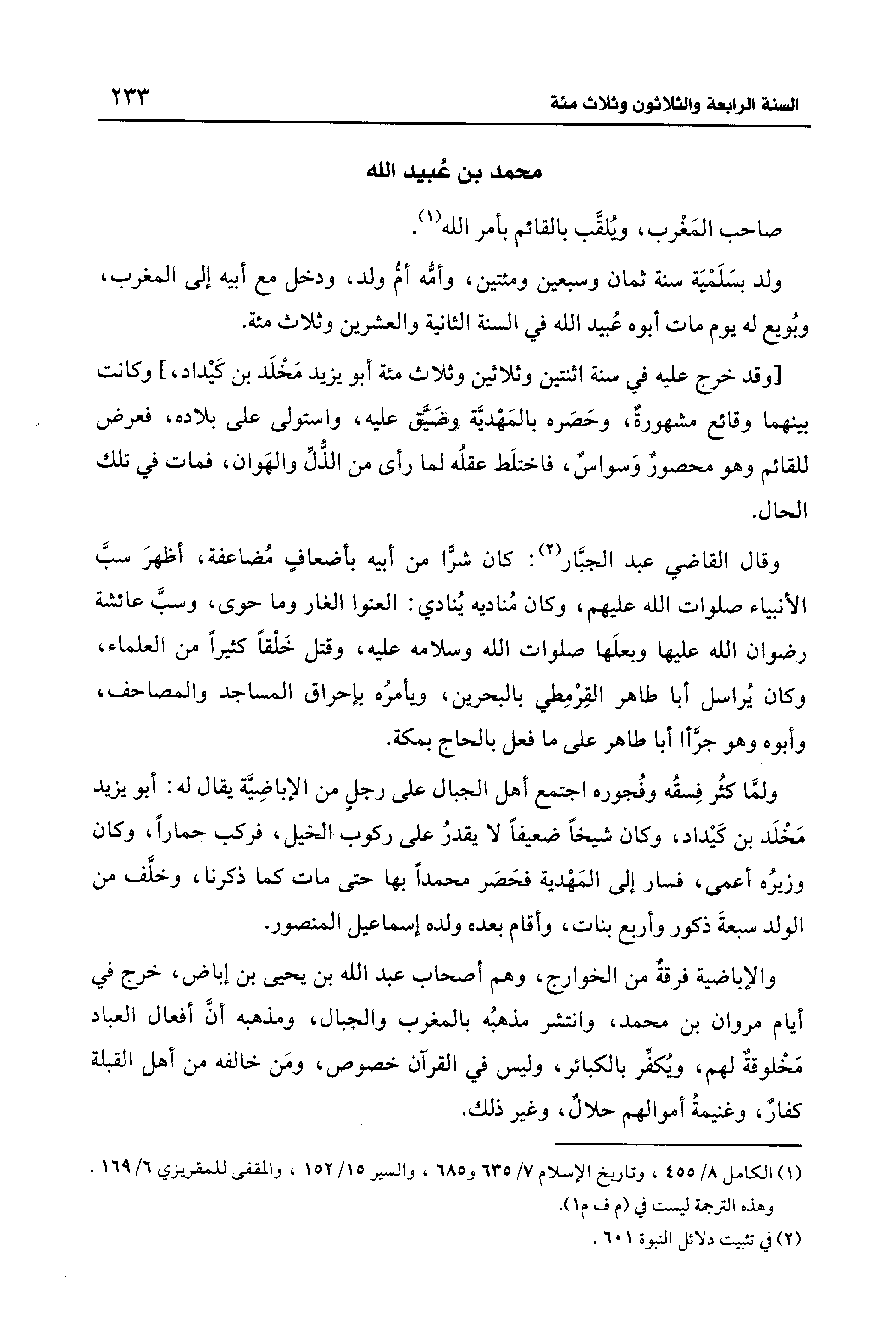 ولمَّا كثُر فِسقُه وفُجوره اجتمع أهل الجبال على رجلٍ من الإباضِيَّة يقال له: أبو يزيد مَخْلَد بن كَيْداد، وكان شيخًا ضعيفًا لا يقدرُ على ركوب الخيل، فركب حمارًا، وكان وزيرُه أعمى، فسار إلى المَهْدية فحَصَر محمدًا بها حتى مات كما ذكرنا، وخلَّف من الولد سبعةَ ذكور وأربع بنات، وأقام بعده ولده إسماعيل المنصور.